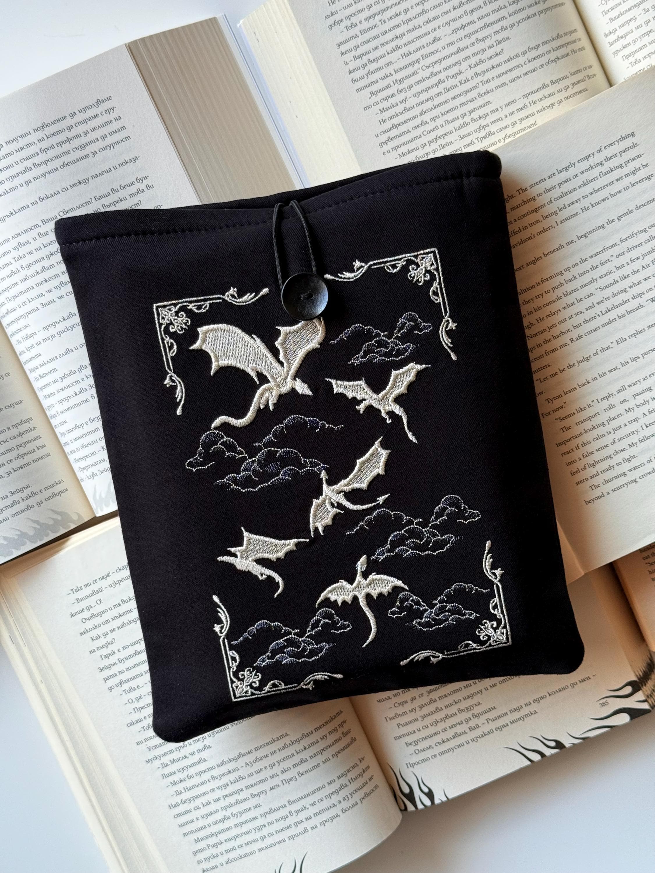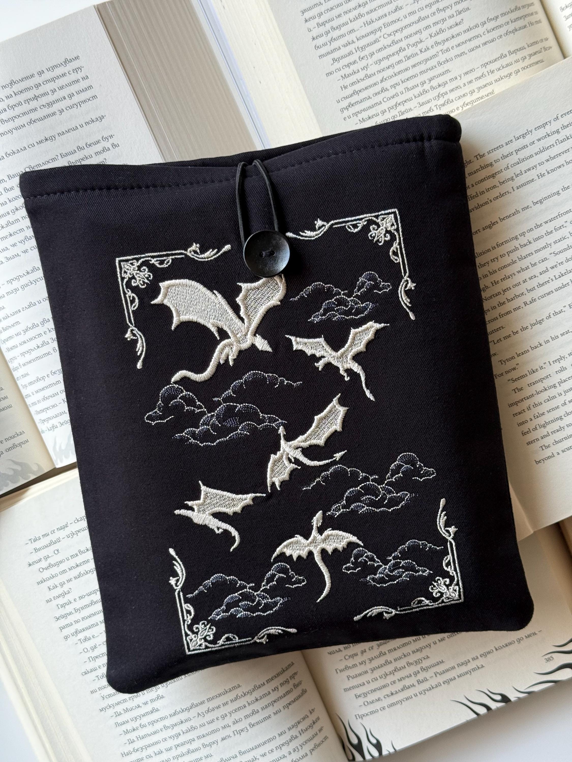 Wrap your favorite books in a touch of magic with this exclusive, handmade designer book sleeve, featuring my original” Dragons in the Sky” embroidery. Each piece is carefully crafted with high-quality machine embroidery, bringing an ethereal and dreamy aesthetic to your book collection.