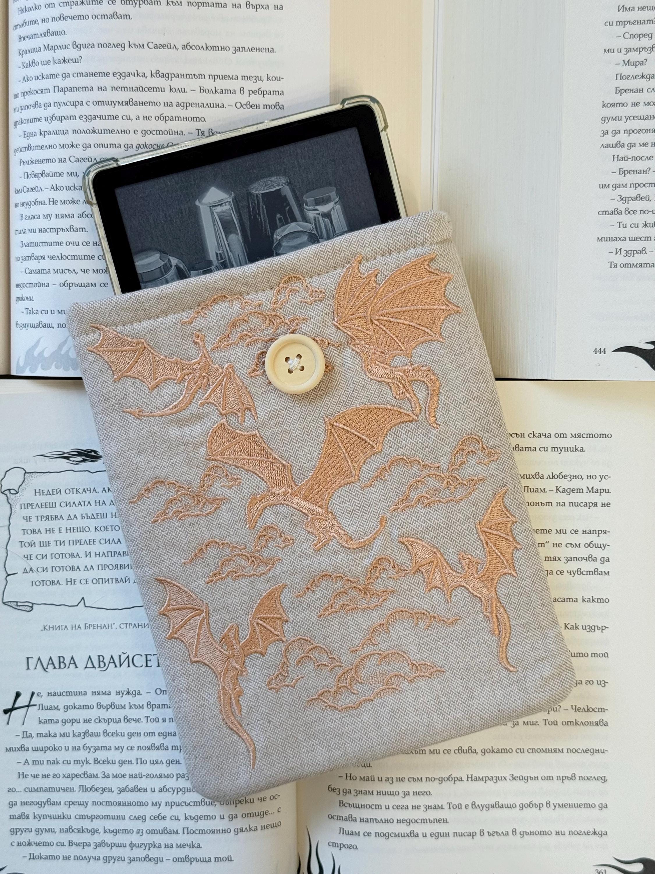 Dragons Embroidery Padded Kindle Sleeve – Handmade Book Protector – E-Reader Fabric Cover – Fantasy Bookish Gift