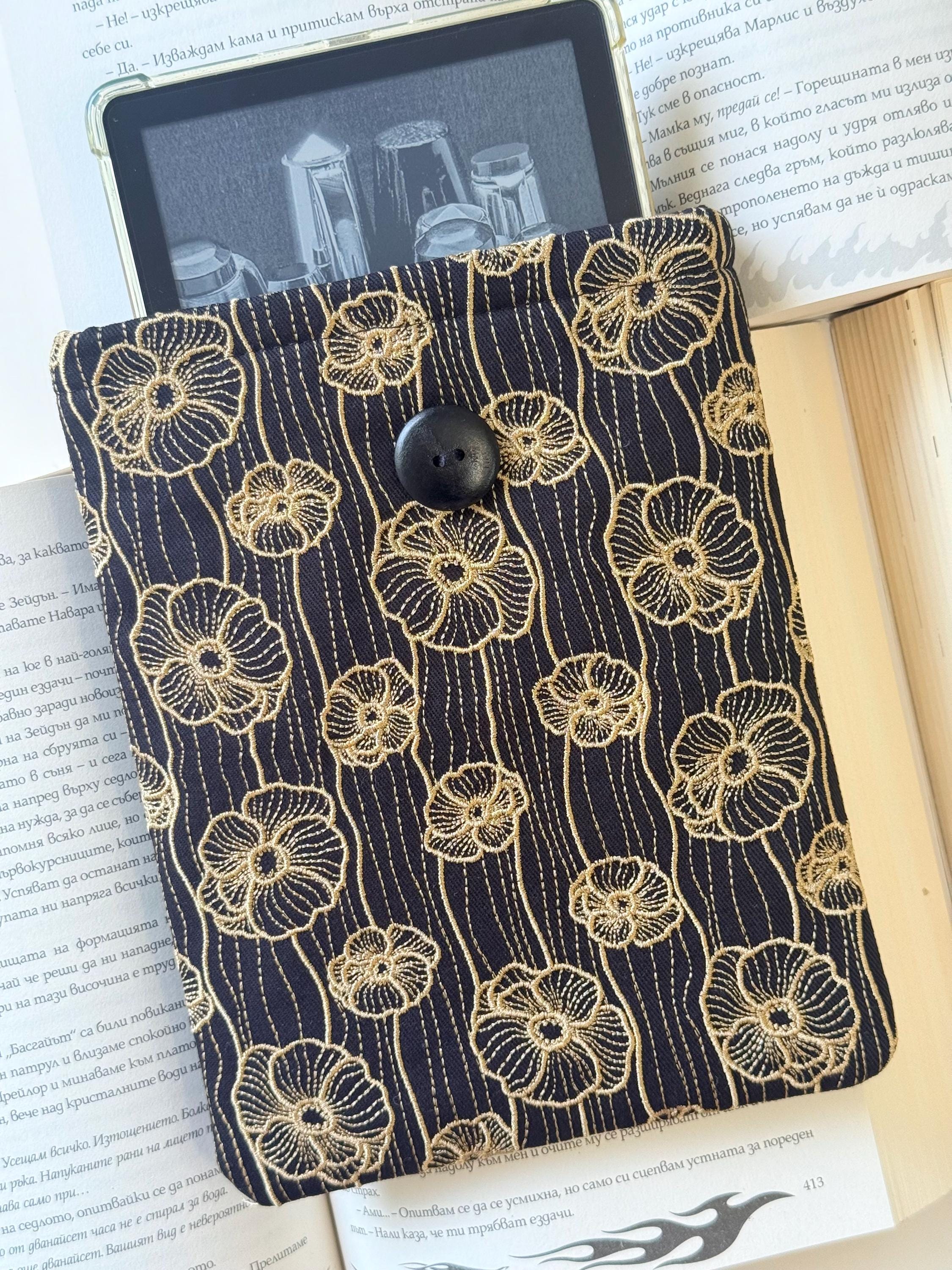 Embroidery Poppy Flowers Padded Kindle Sleeve – Handmade Fabric Cover by Lullaby Crafts World