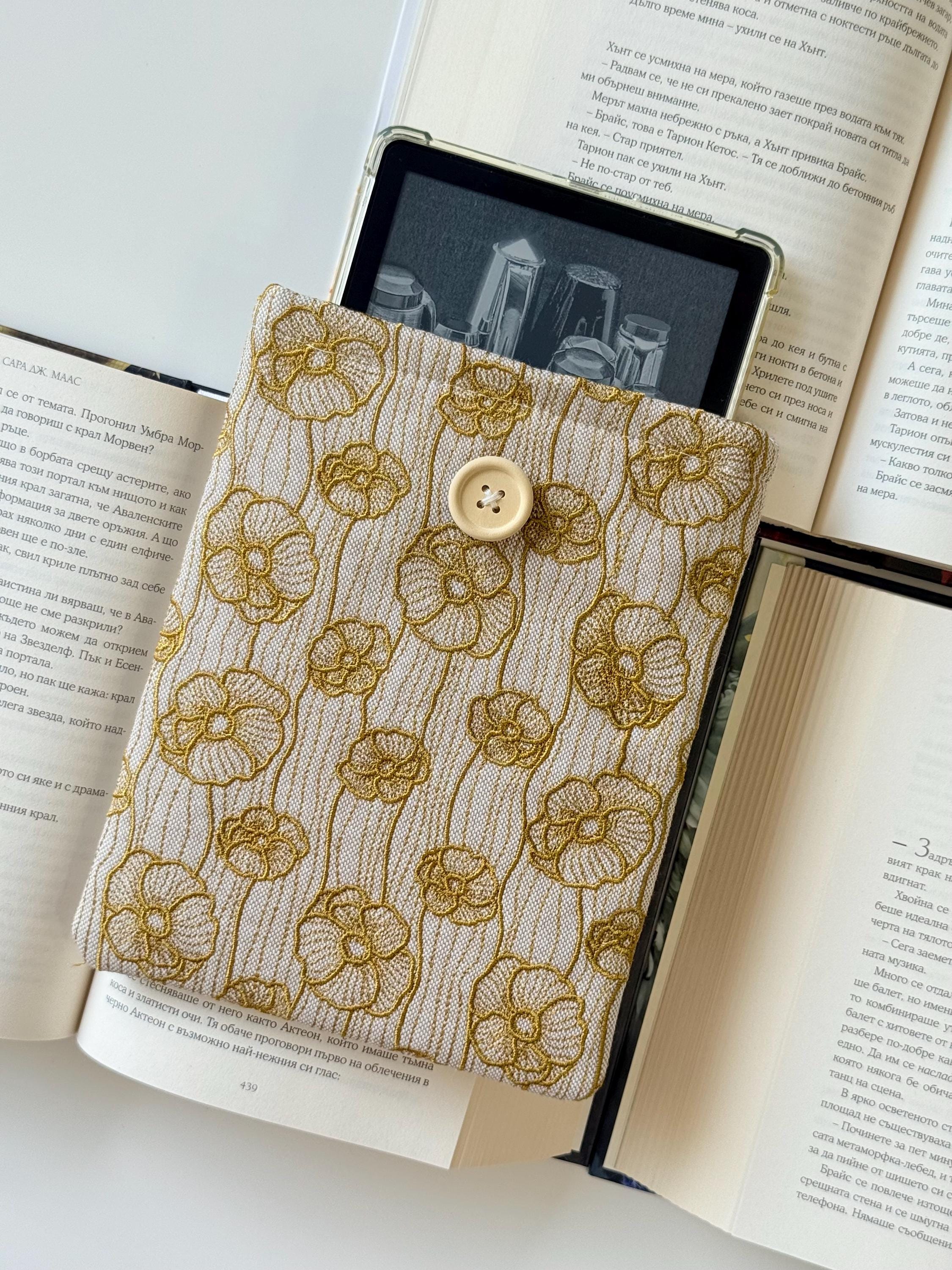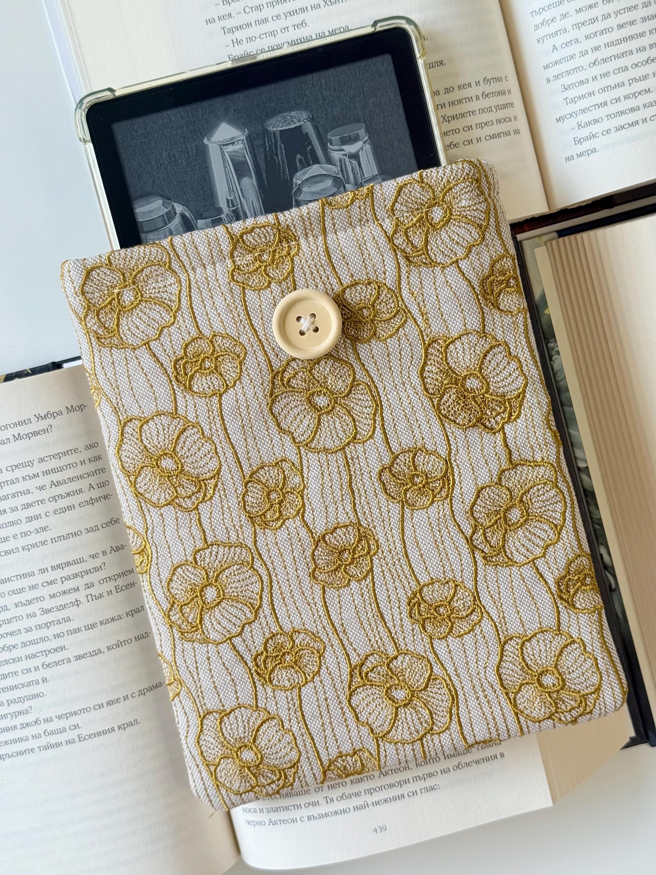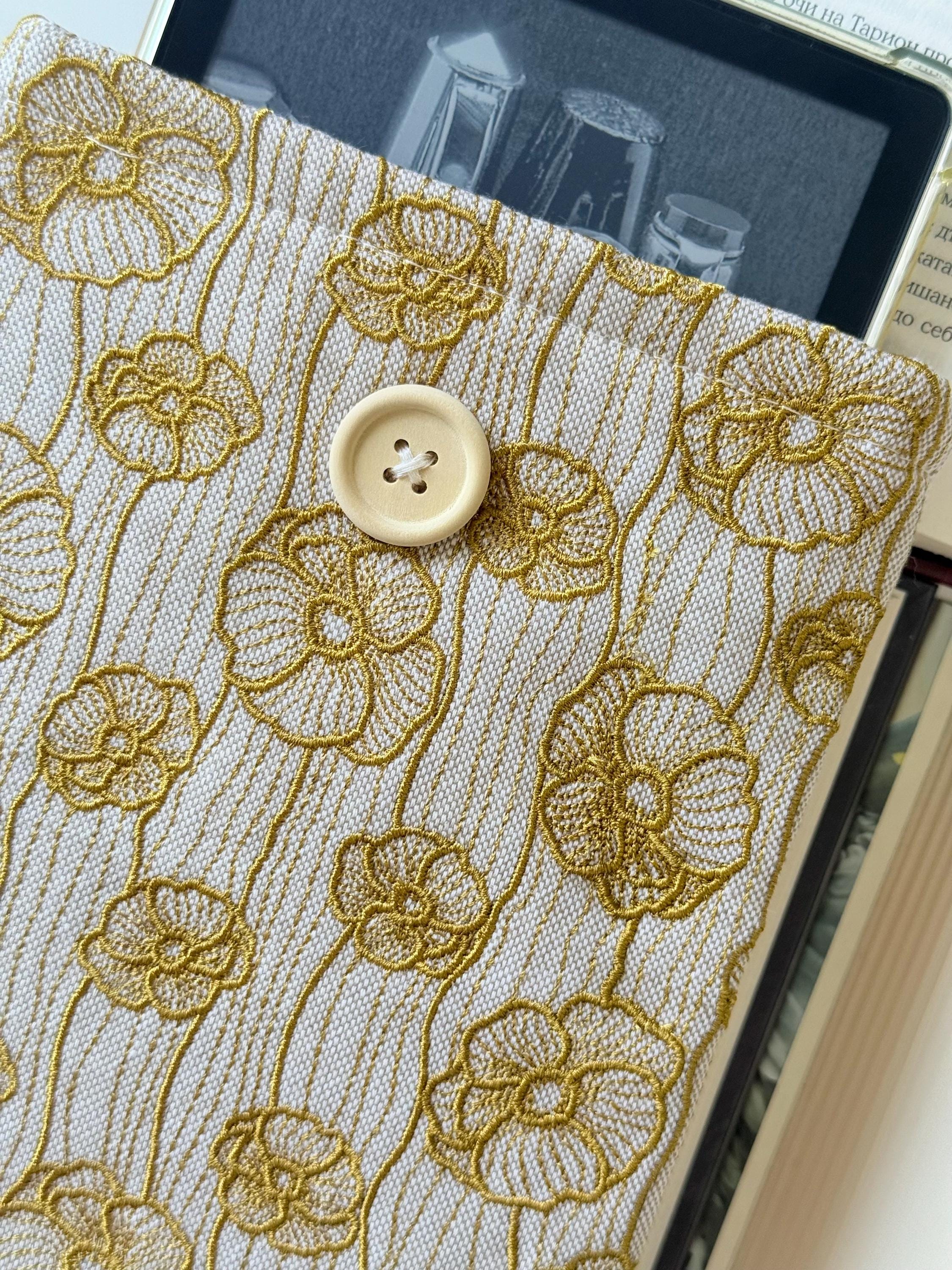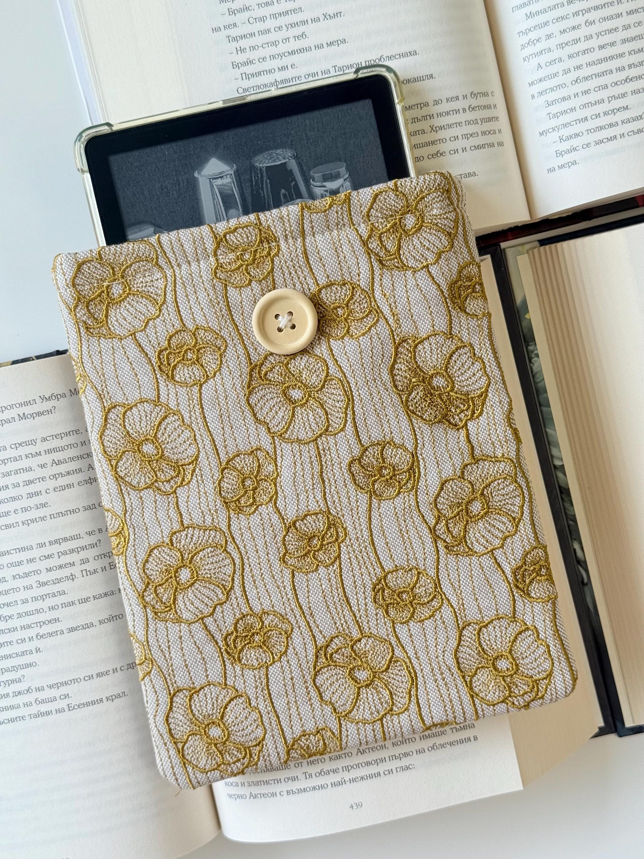 Elegant Embroidered Poppy Flowers Kindle Sleeve – Handmade Padded Fabric Cover, Gift for Book Lovers