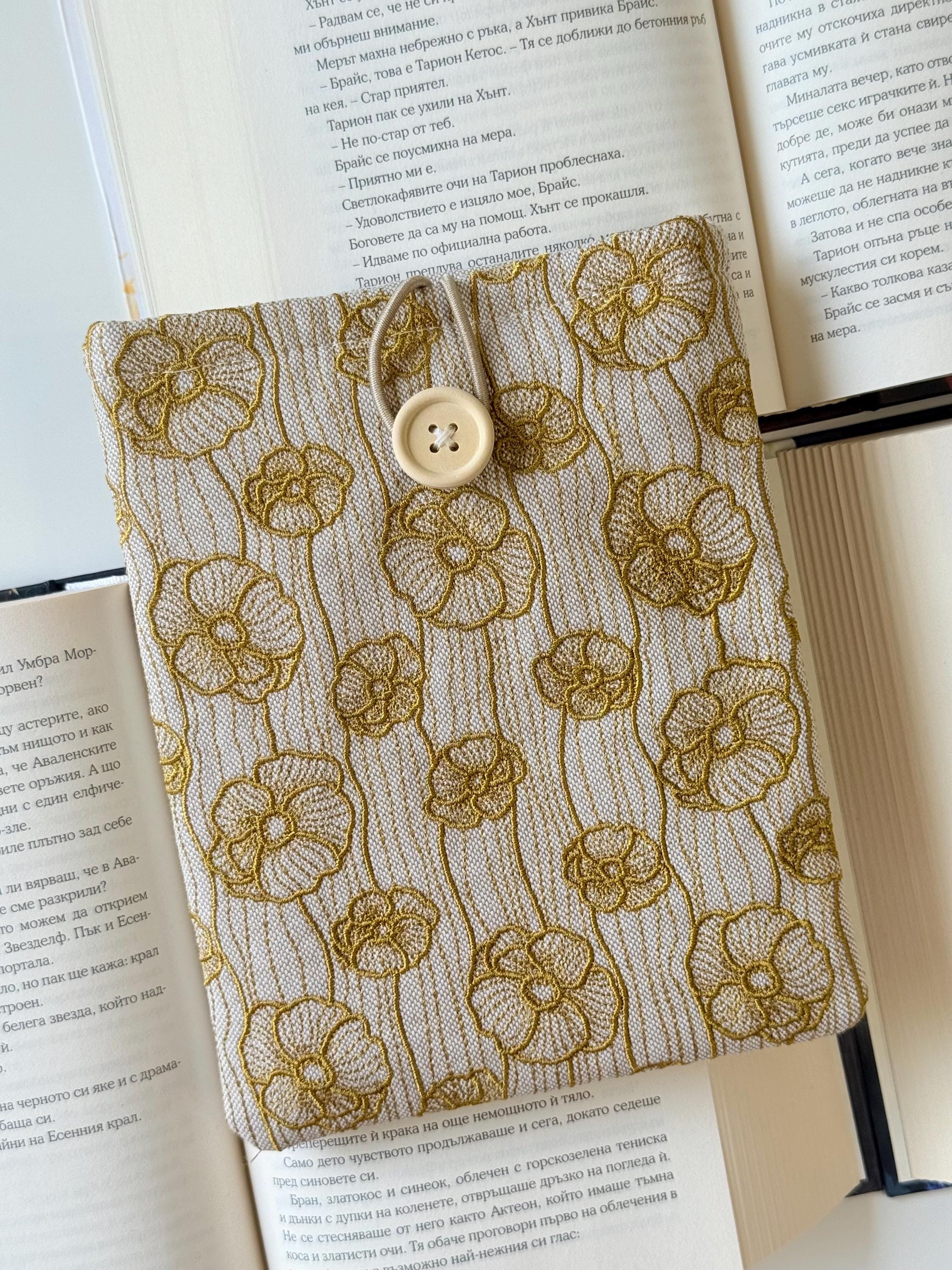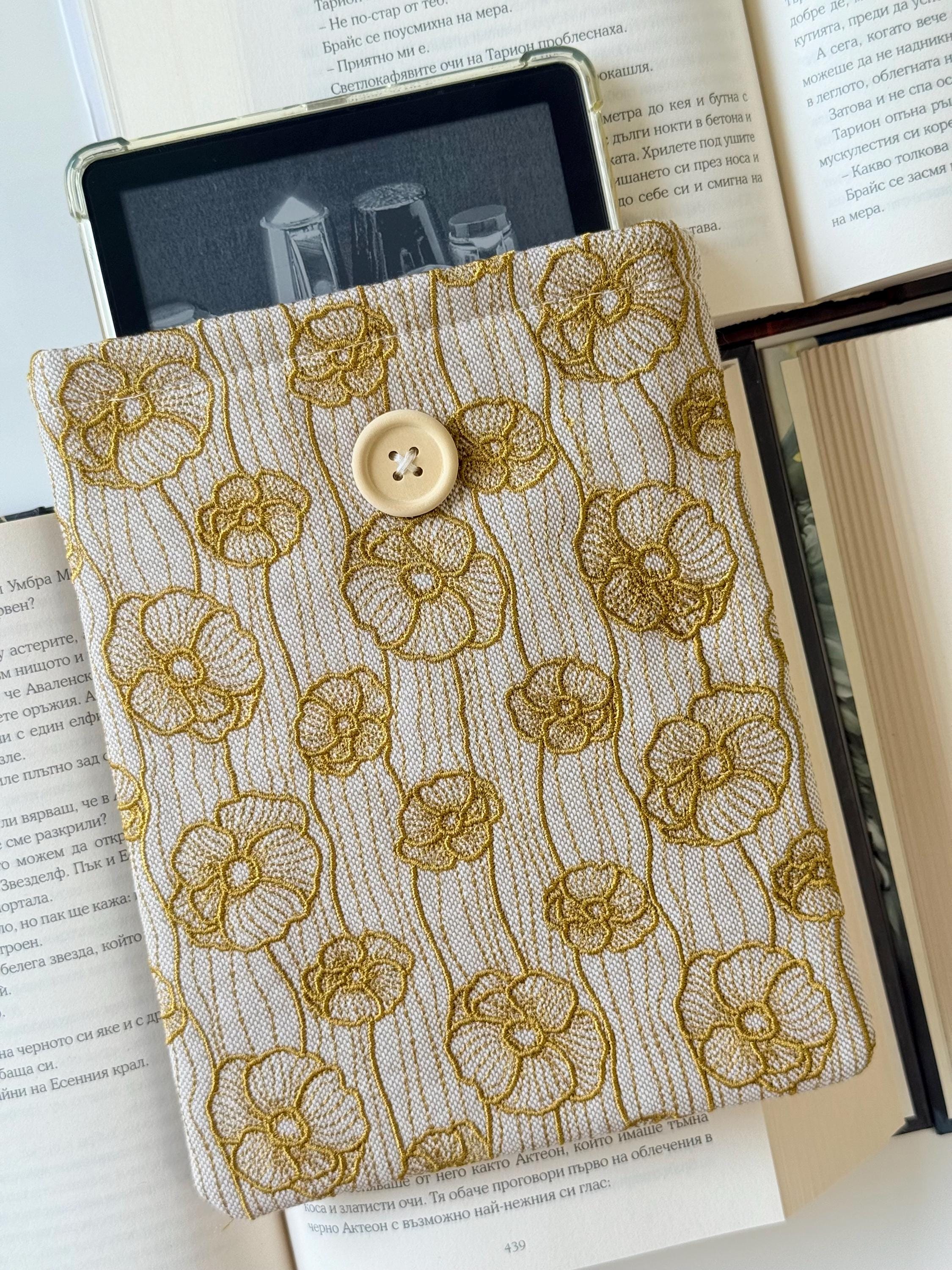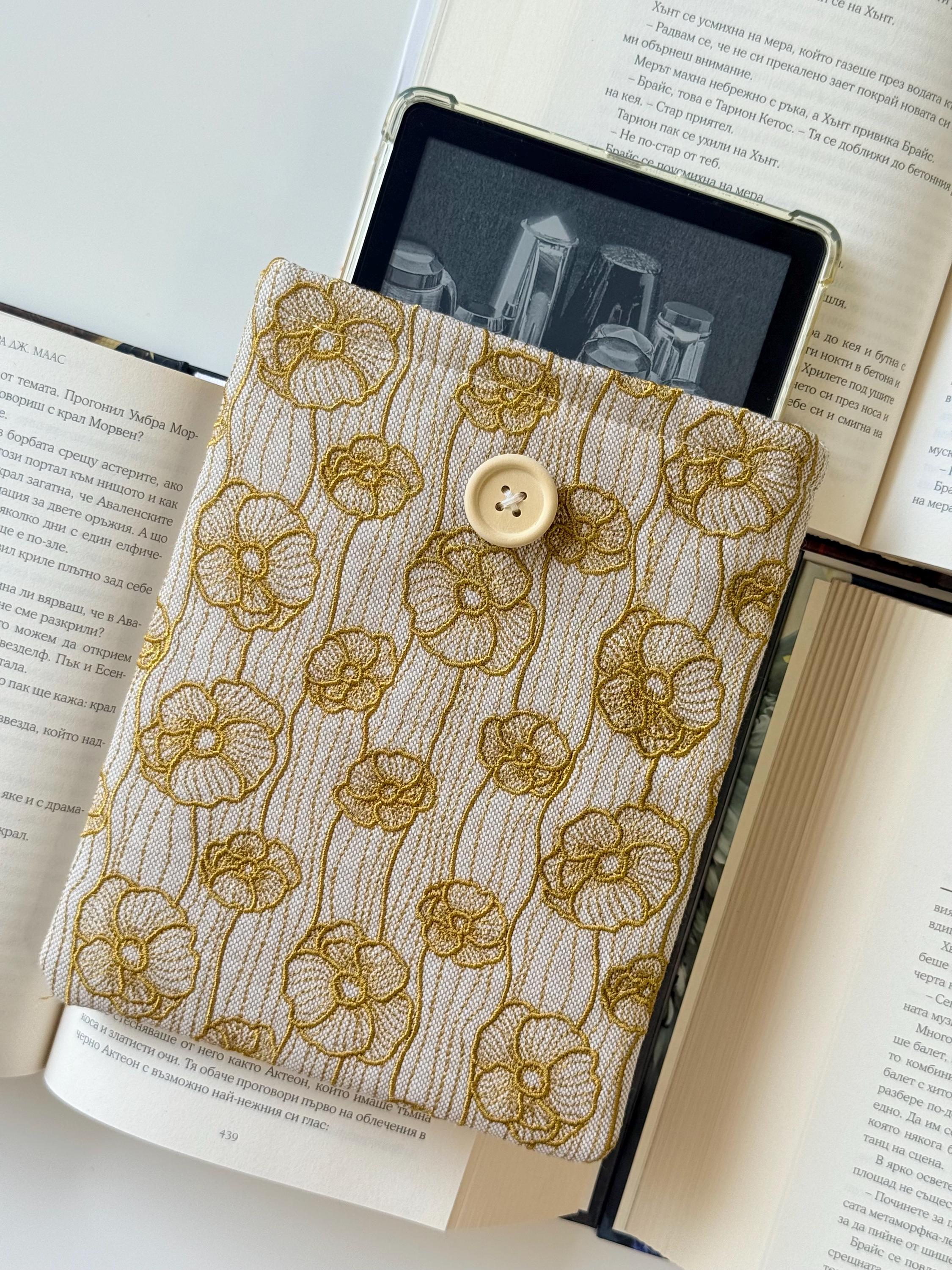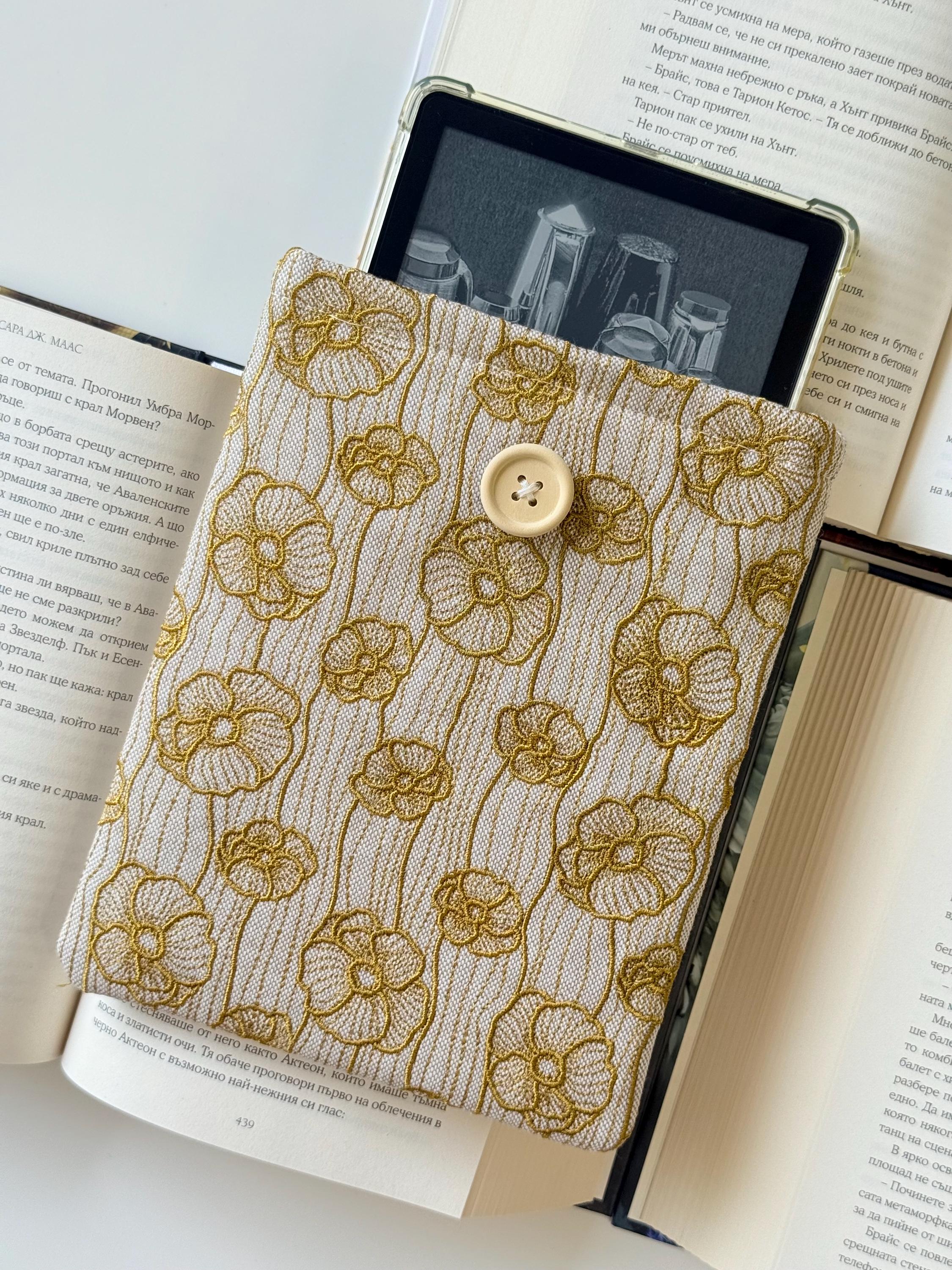 Elegant Embroidered Poppy Flowers Kindle Sleeve – Handmade Padded Fabric Cover, Gift for Book Lovers