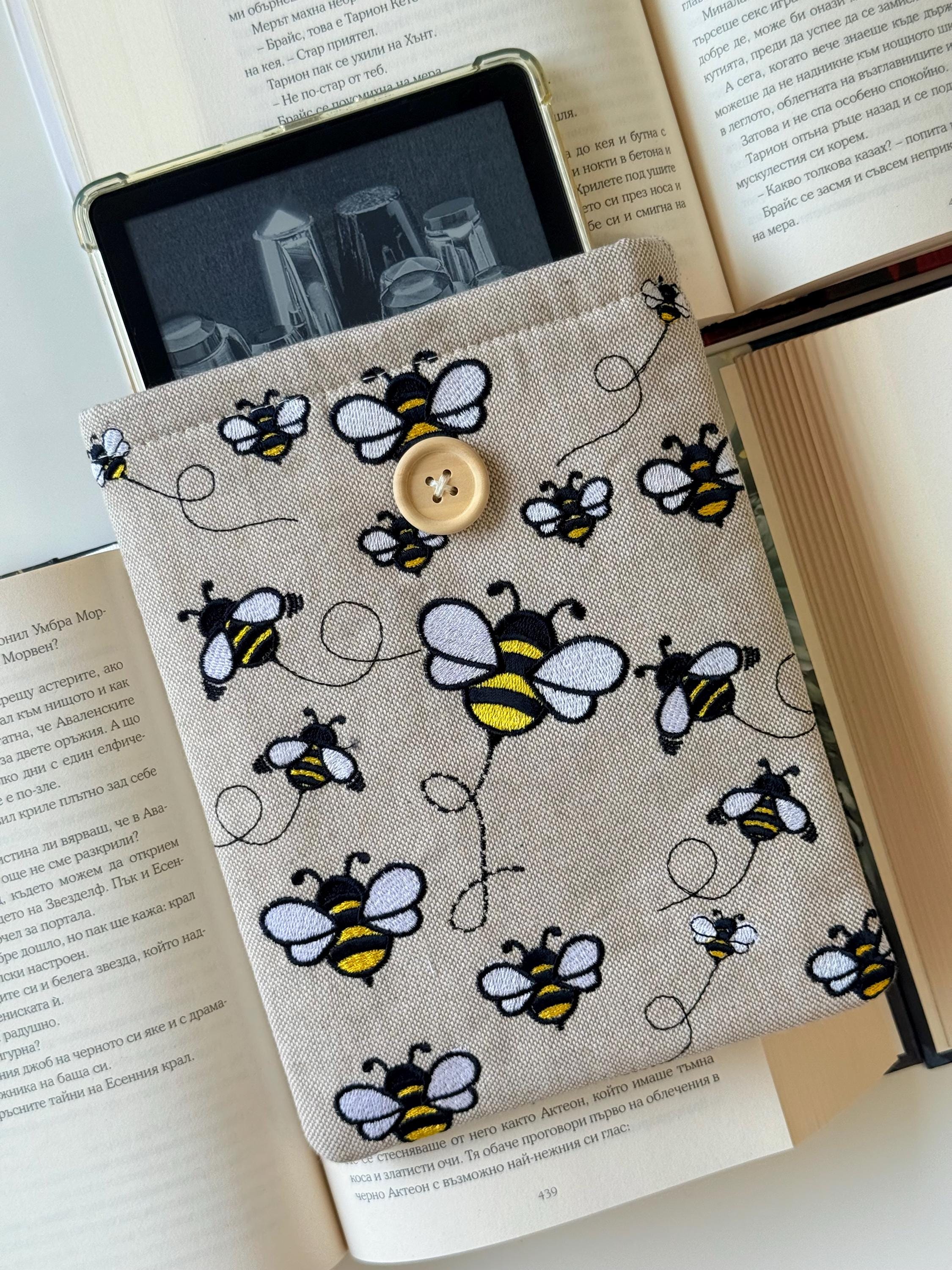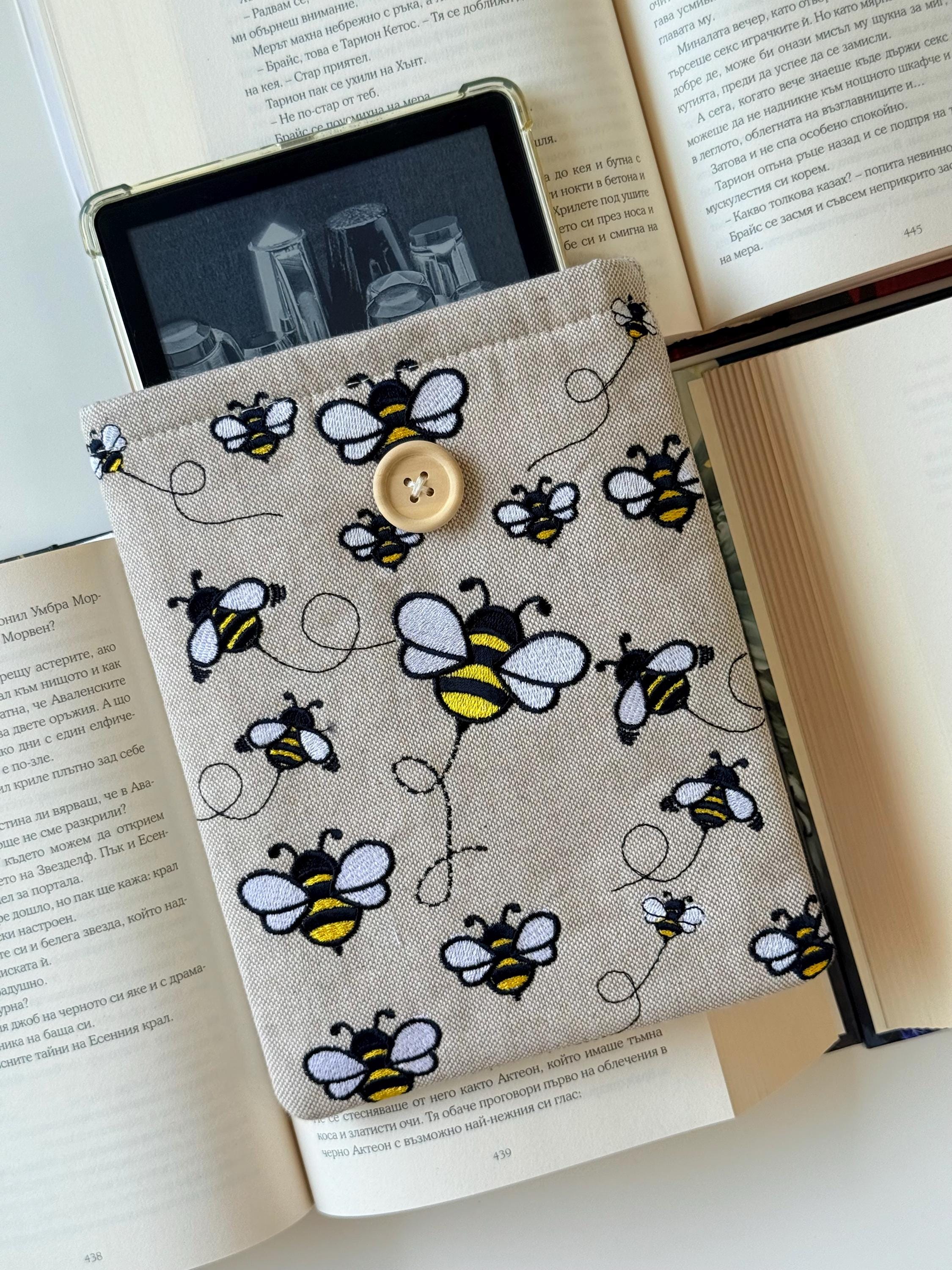 Bring a little buzz to your reading 🐝 This handmade padded Kindle sleeve features my own original bee embroidery design, created exclusively for Lullaby Crafts World. Unique and nature-inspired, it protects your Kindle or e-reader from scratches and dust while adding a cozy, floral charm.