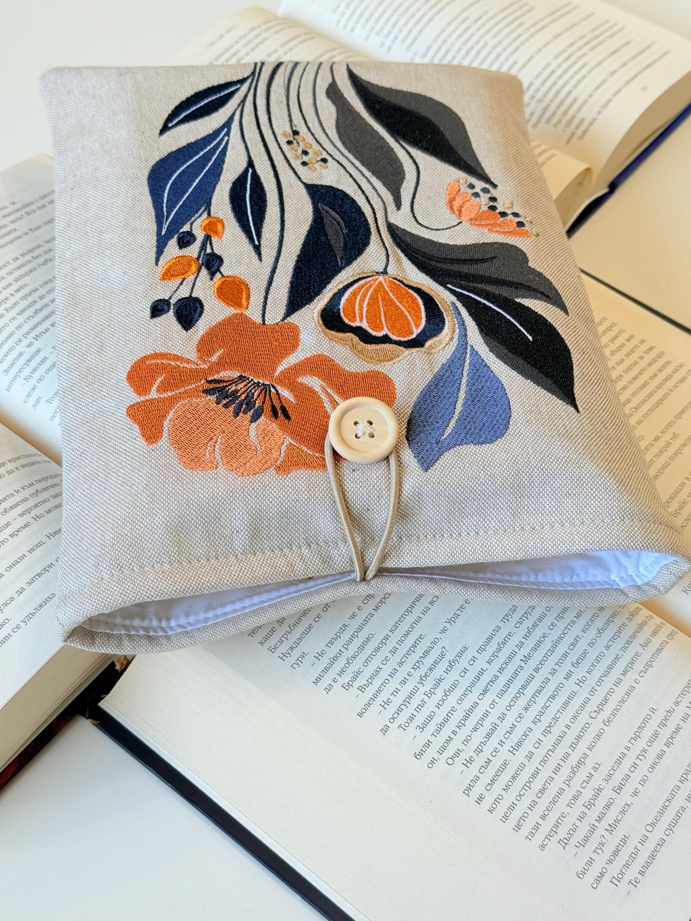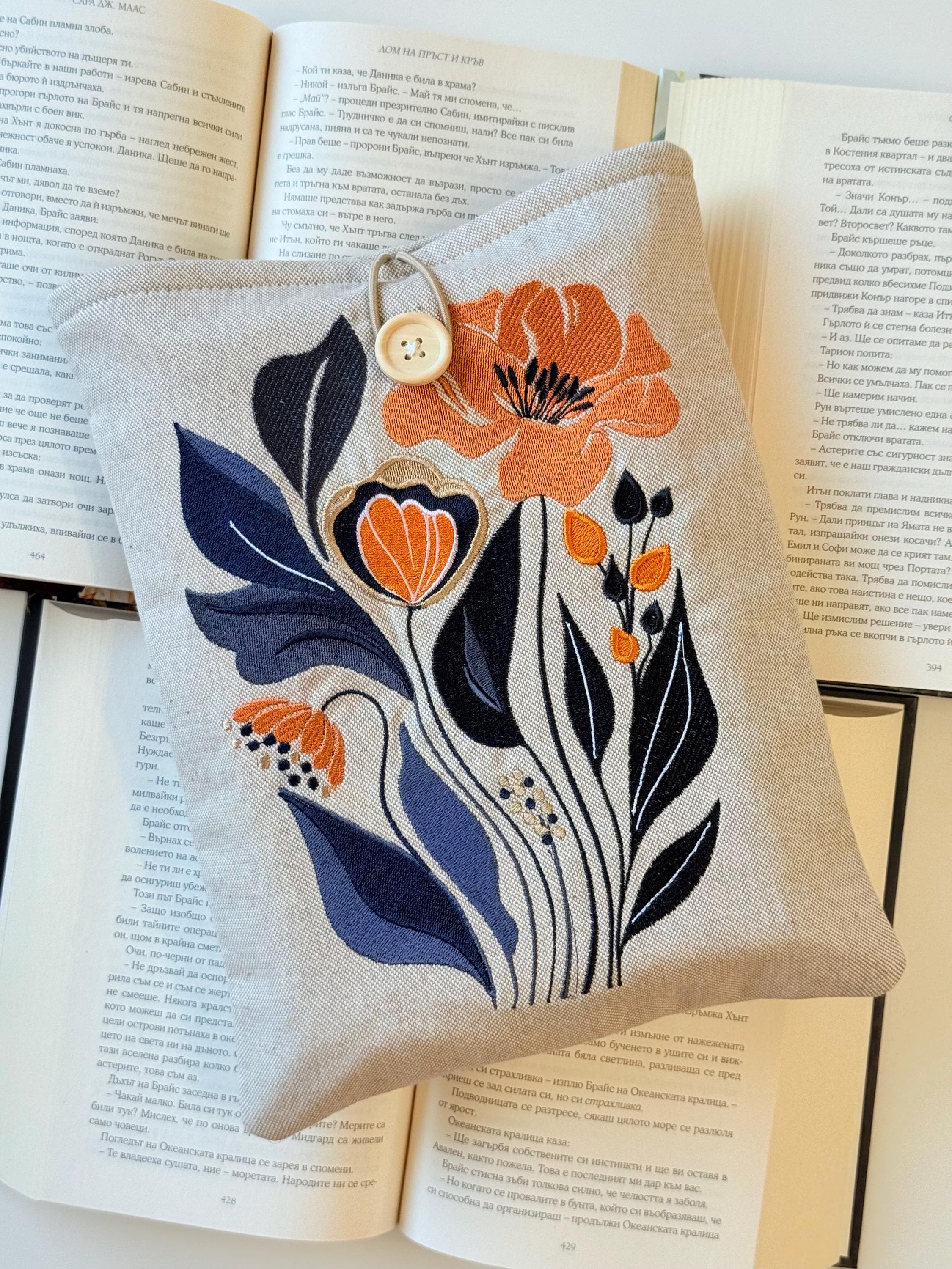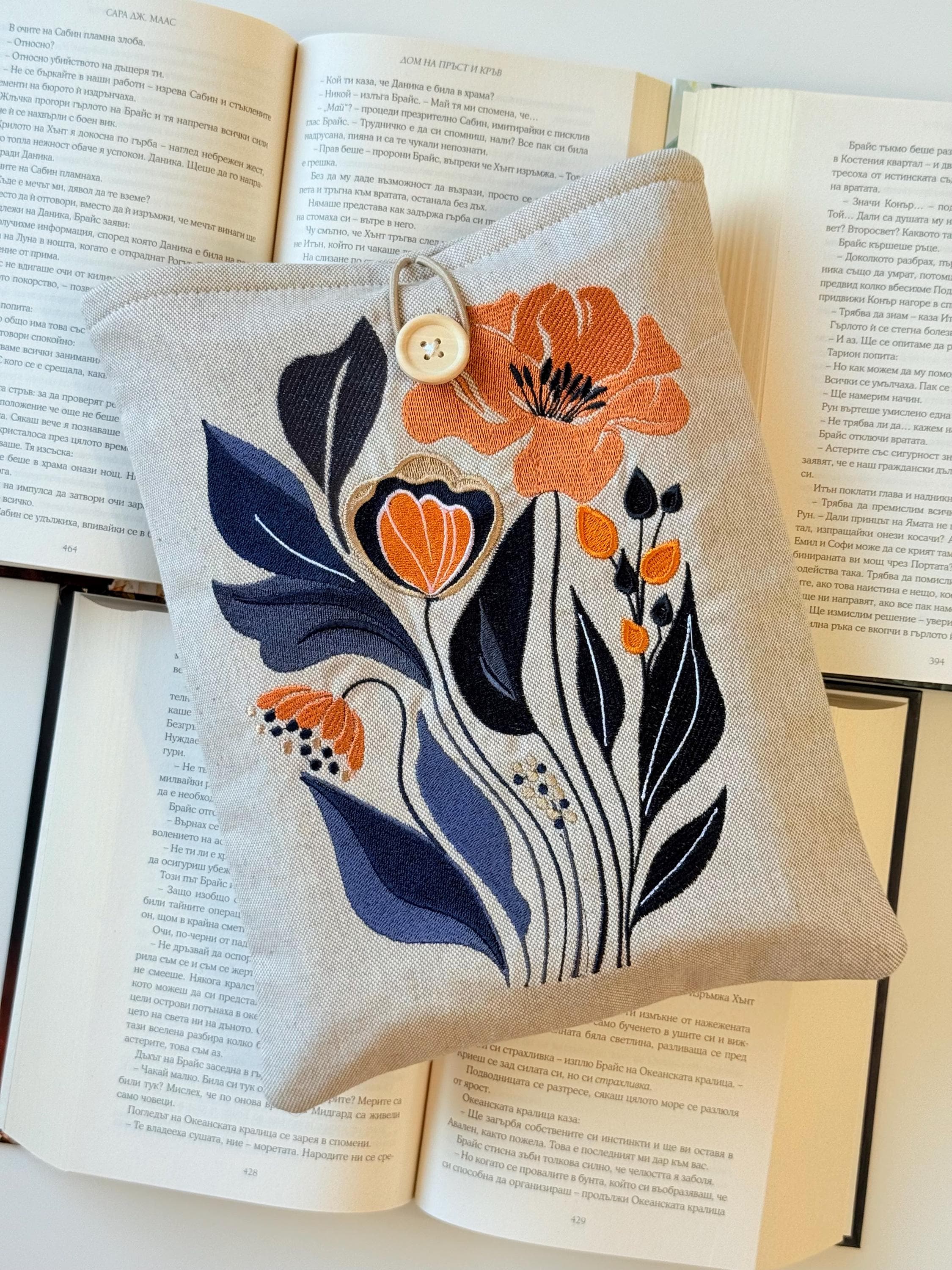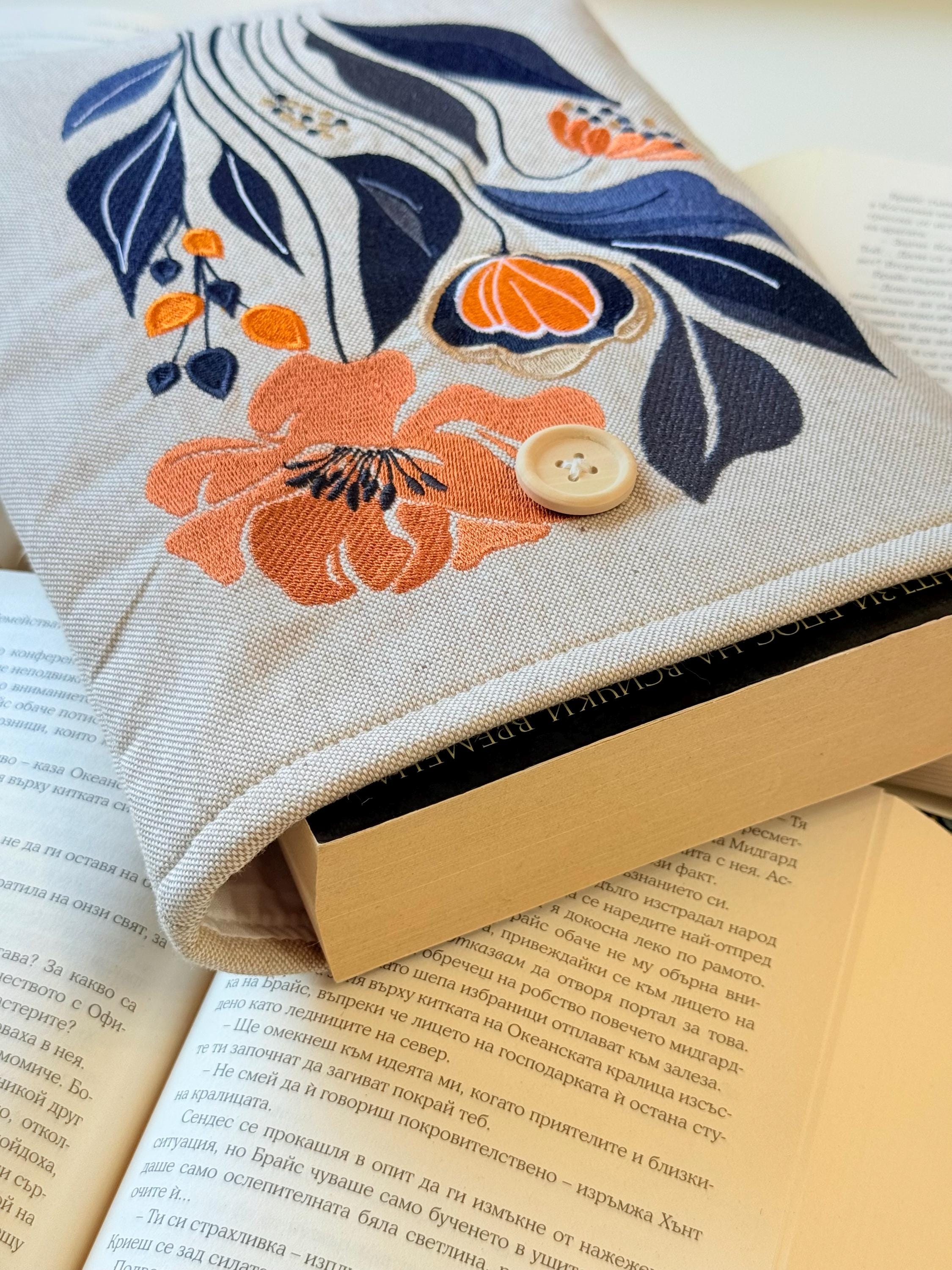 Elegant Flower Embroidery Book Sleeve – Handmade Padded Fabric Protector, Unique Gift for Readers