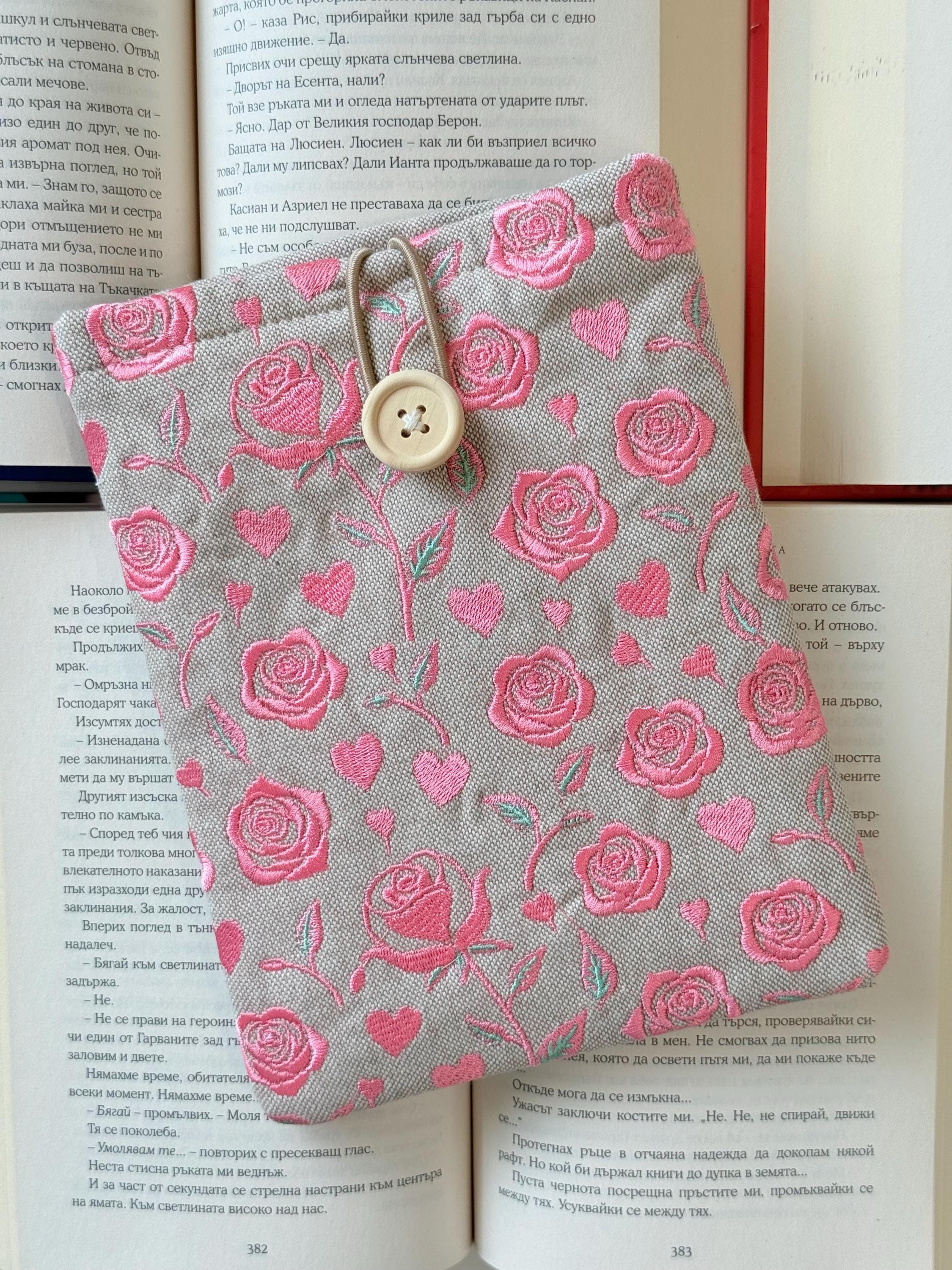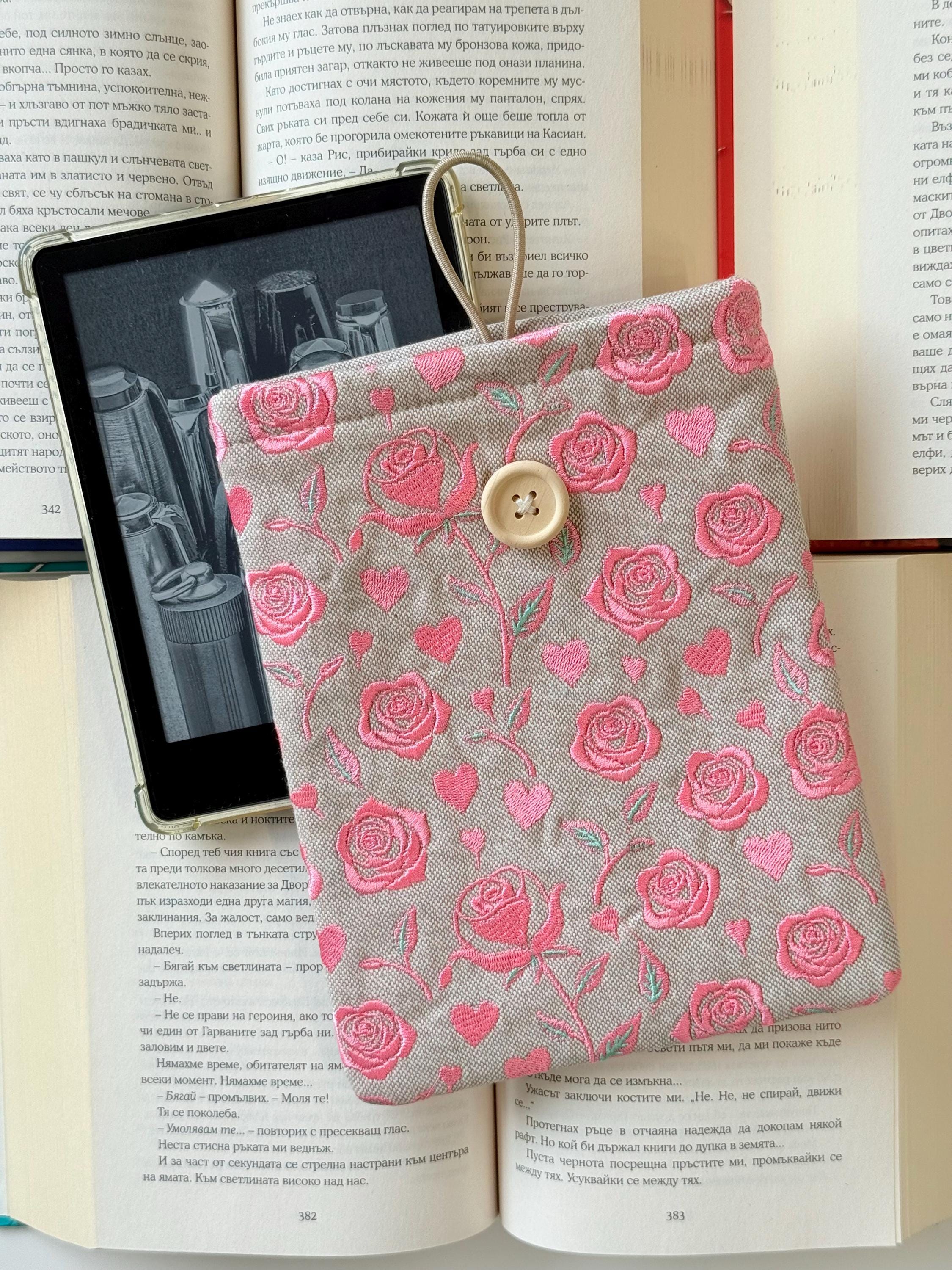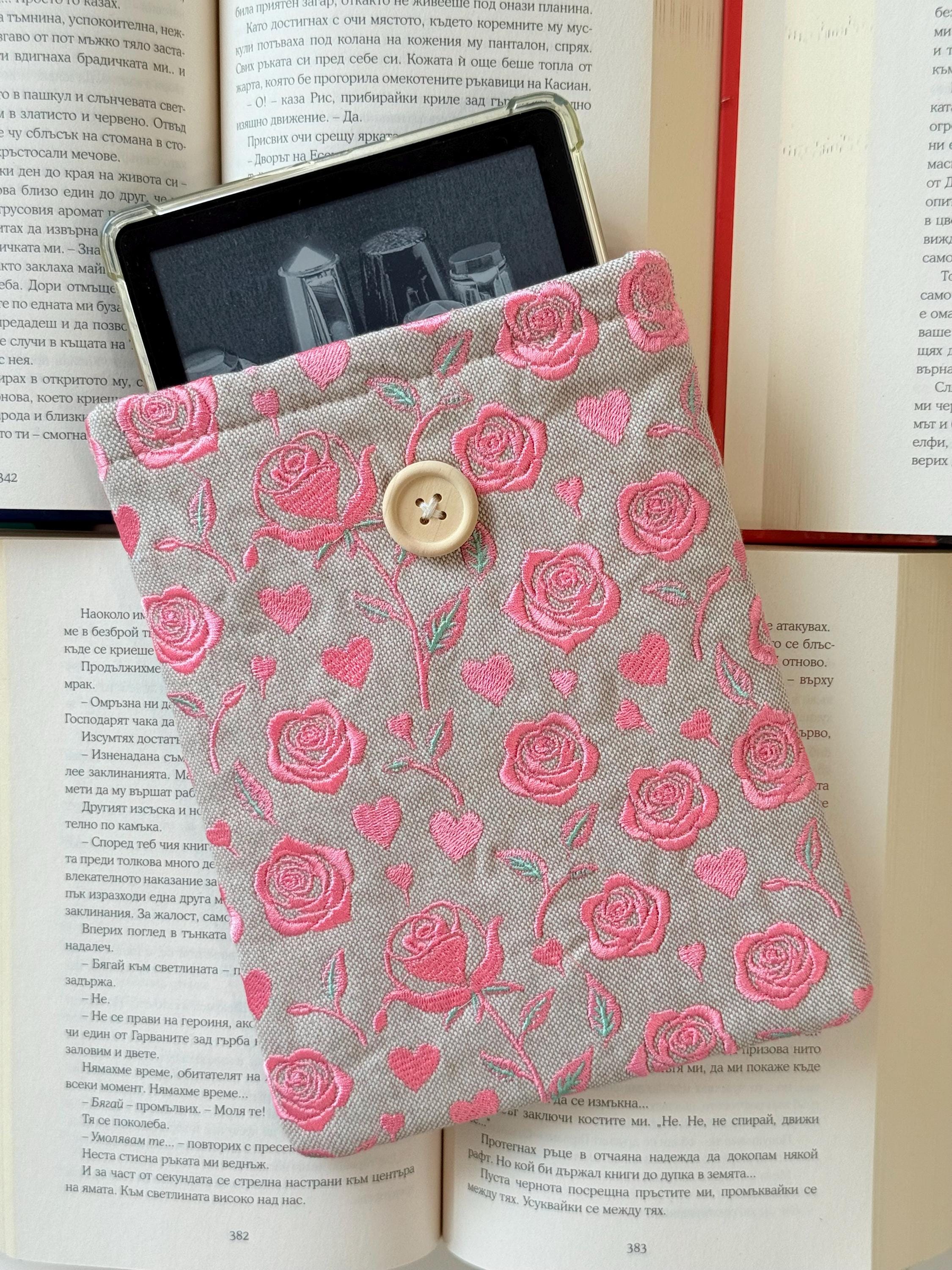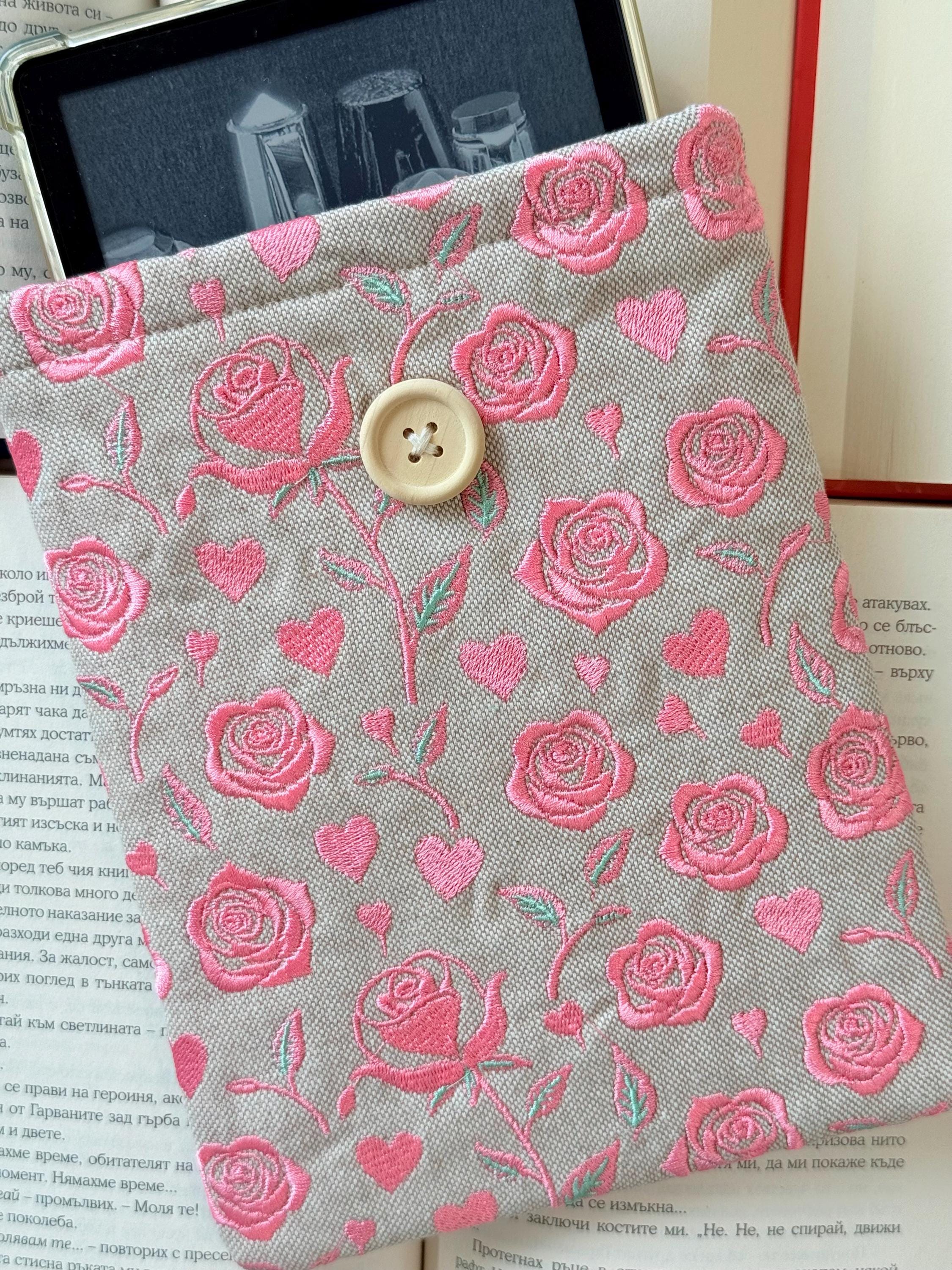 Carry your stories in elegance 🌹 This handmade padded Kindle sleeve features my own original embroidery design of pink roses, created exclusively for Lullaby Crafts World. Unique, romantic, and functional – it keeps your Kindle or e-reader safe from scratches, dust, and daily wear while adding timeless floral charm.