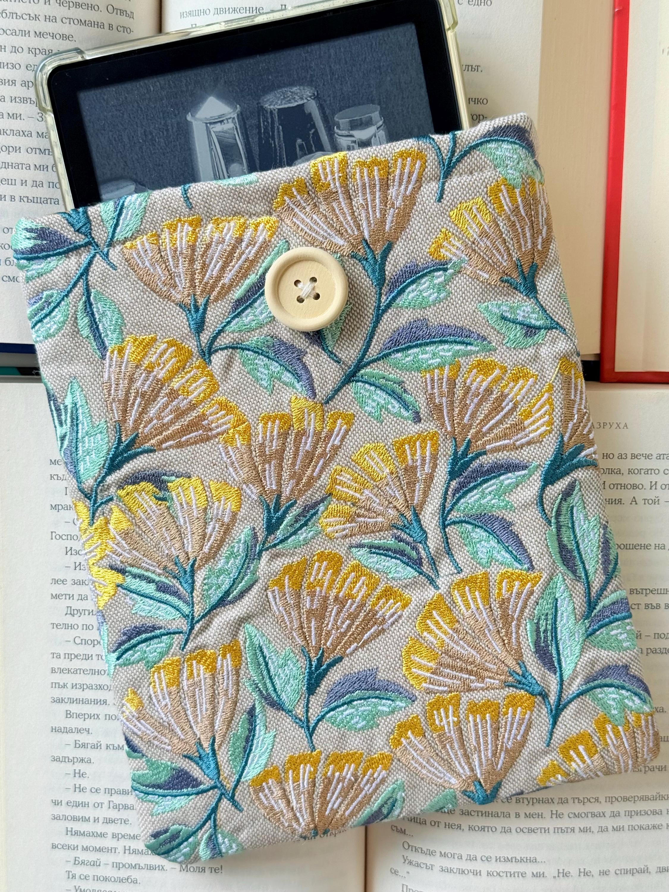 A versatile embroidery sleeve that is designed to fit standard Kindle and E- Reader devices with sleeve size 16.5 cm x 21 cm or 6.46” x 8.26” inches.