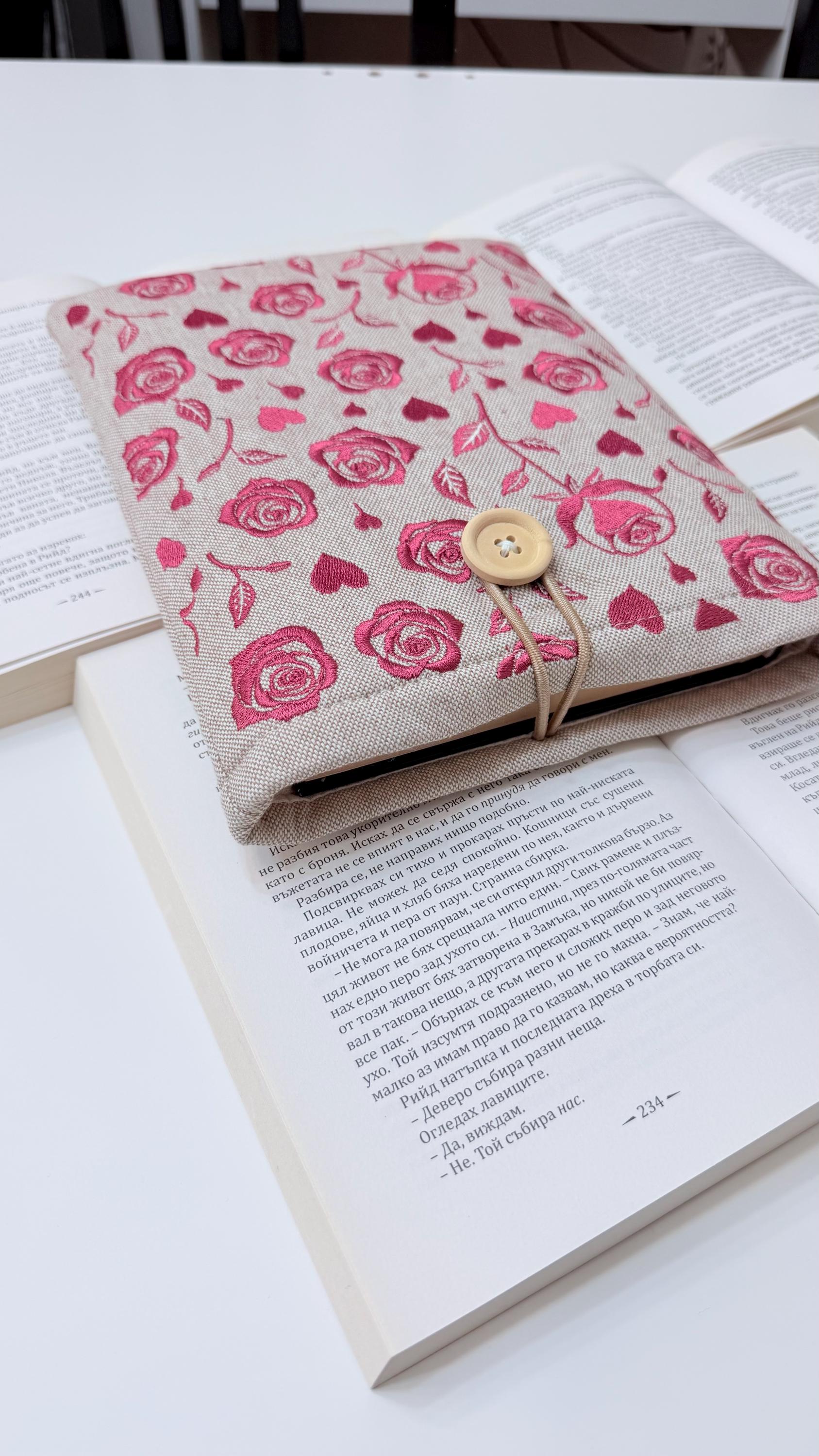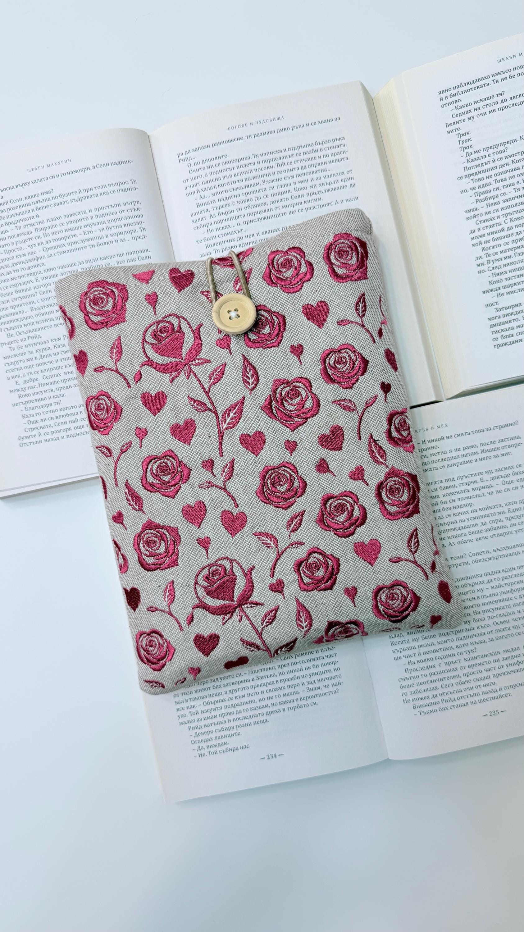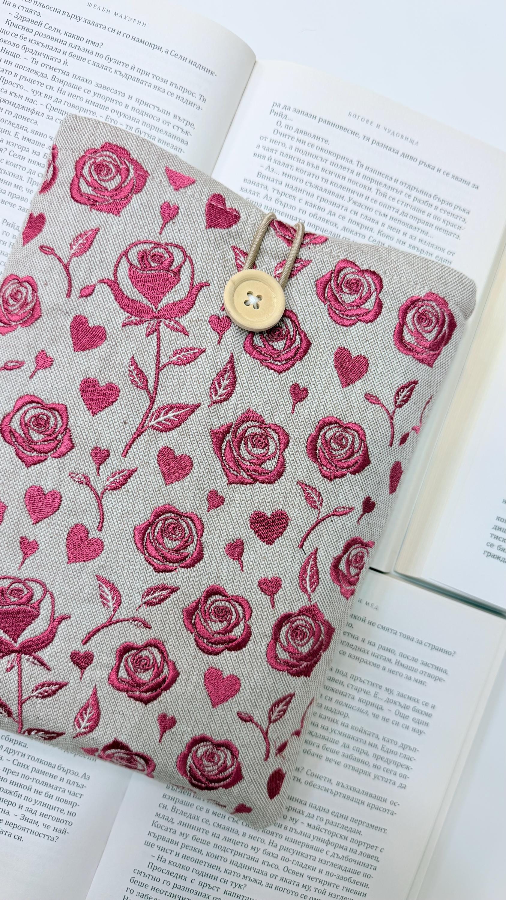 Burgundy Roses Embroidery Padded Book Sleeve – Handmade Original Design by Lullaby Crafts World