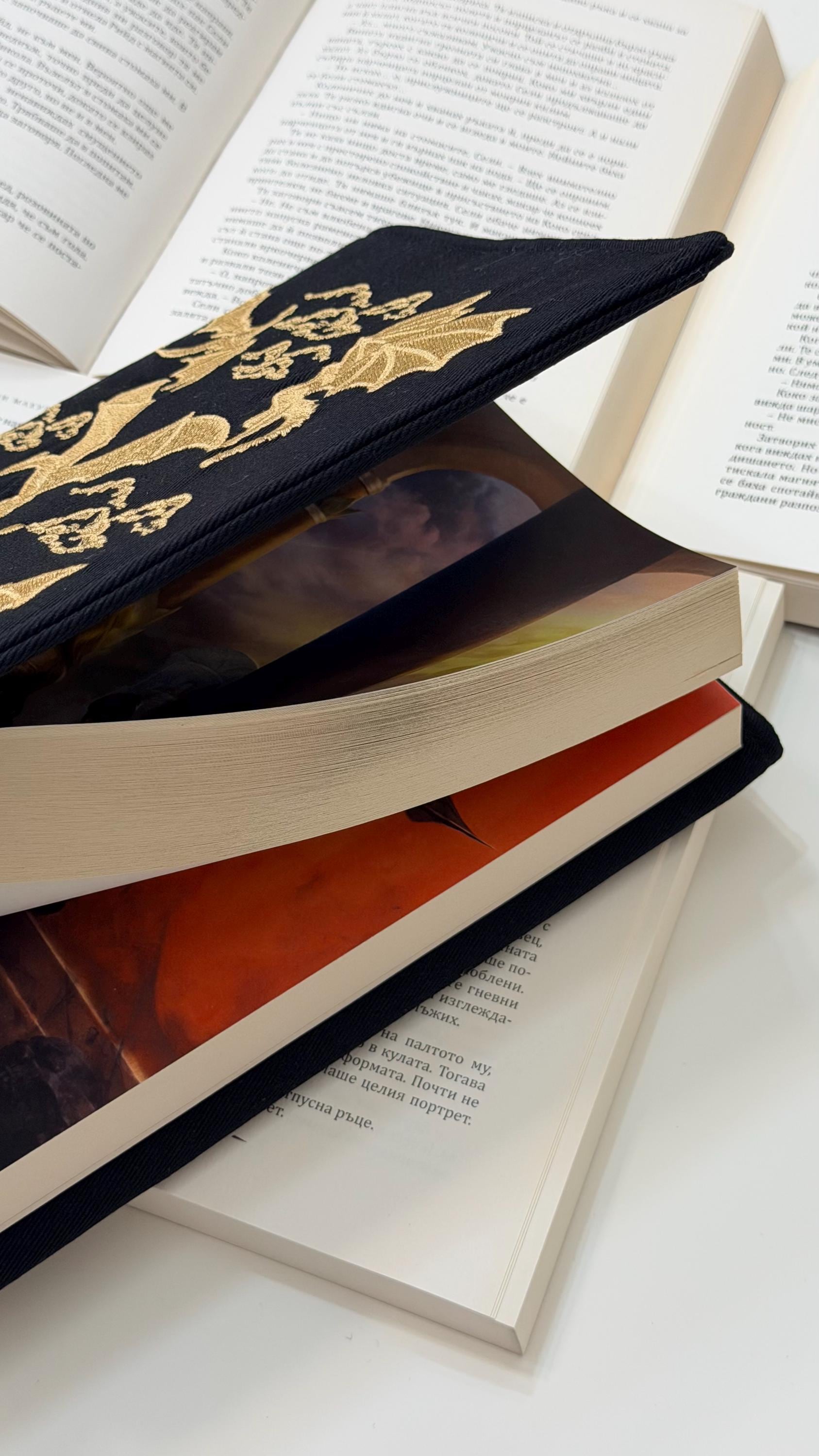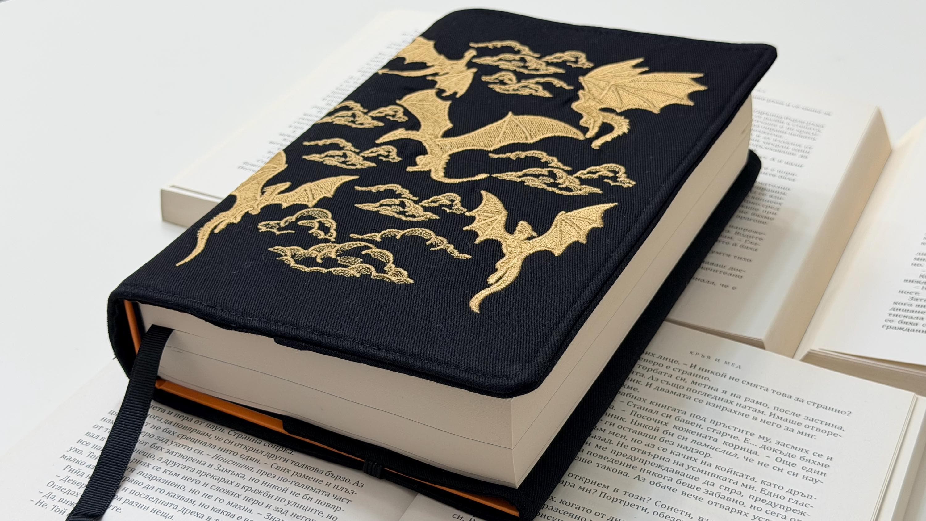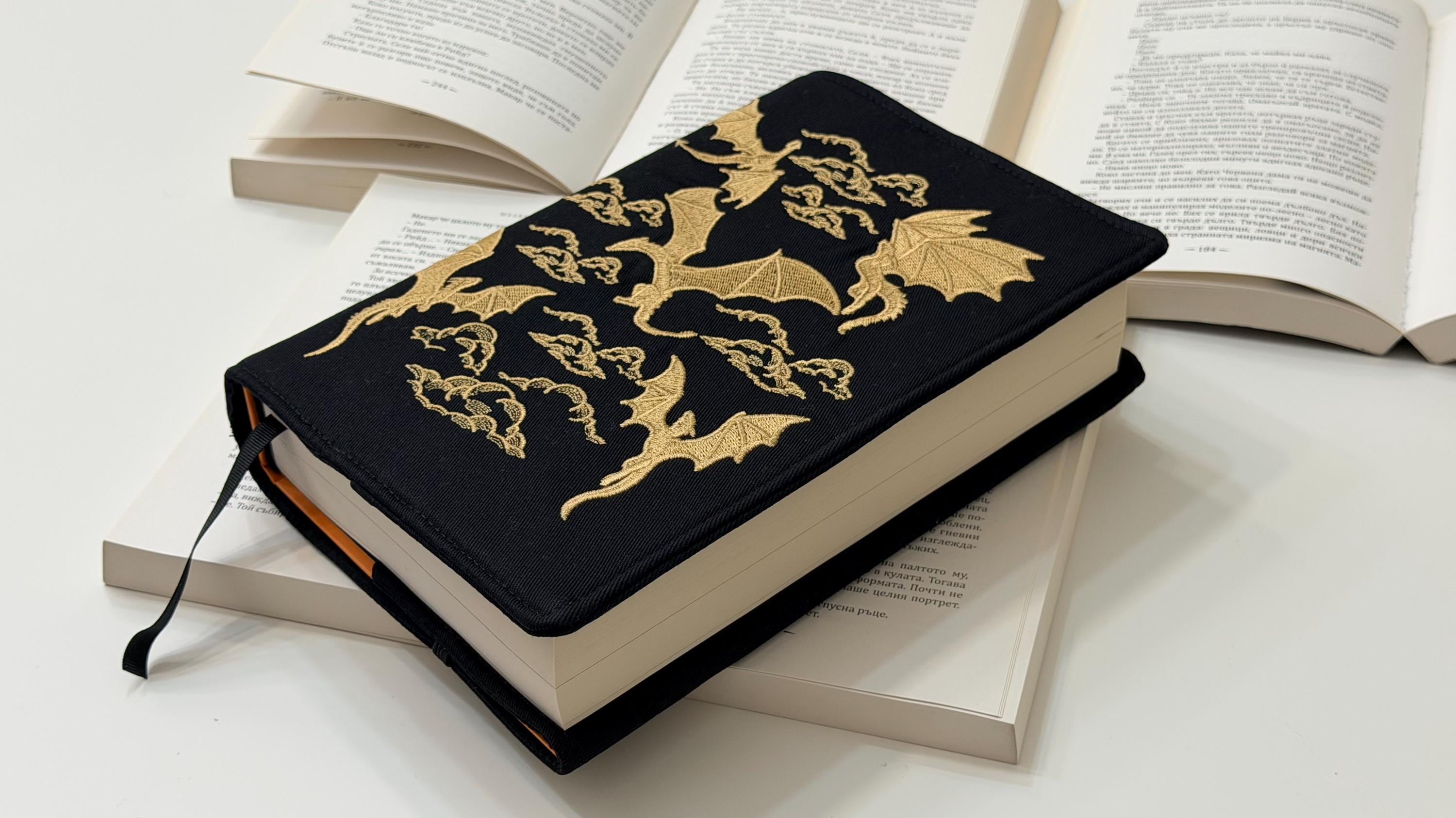 Unleash the magic of reading 🐉✨ This adjustable handmade book cover features my own embroidery design of gold dragons, crafted exclusively for Lullaby Crafts World. Created to snugly fit hardcover books, it offers both protection and fantasy-inspired beauty — the perfect mix of art and functionality.