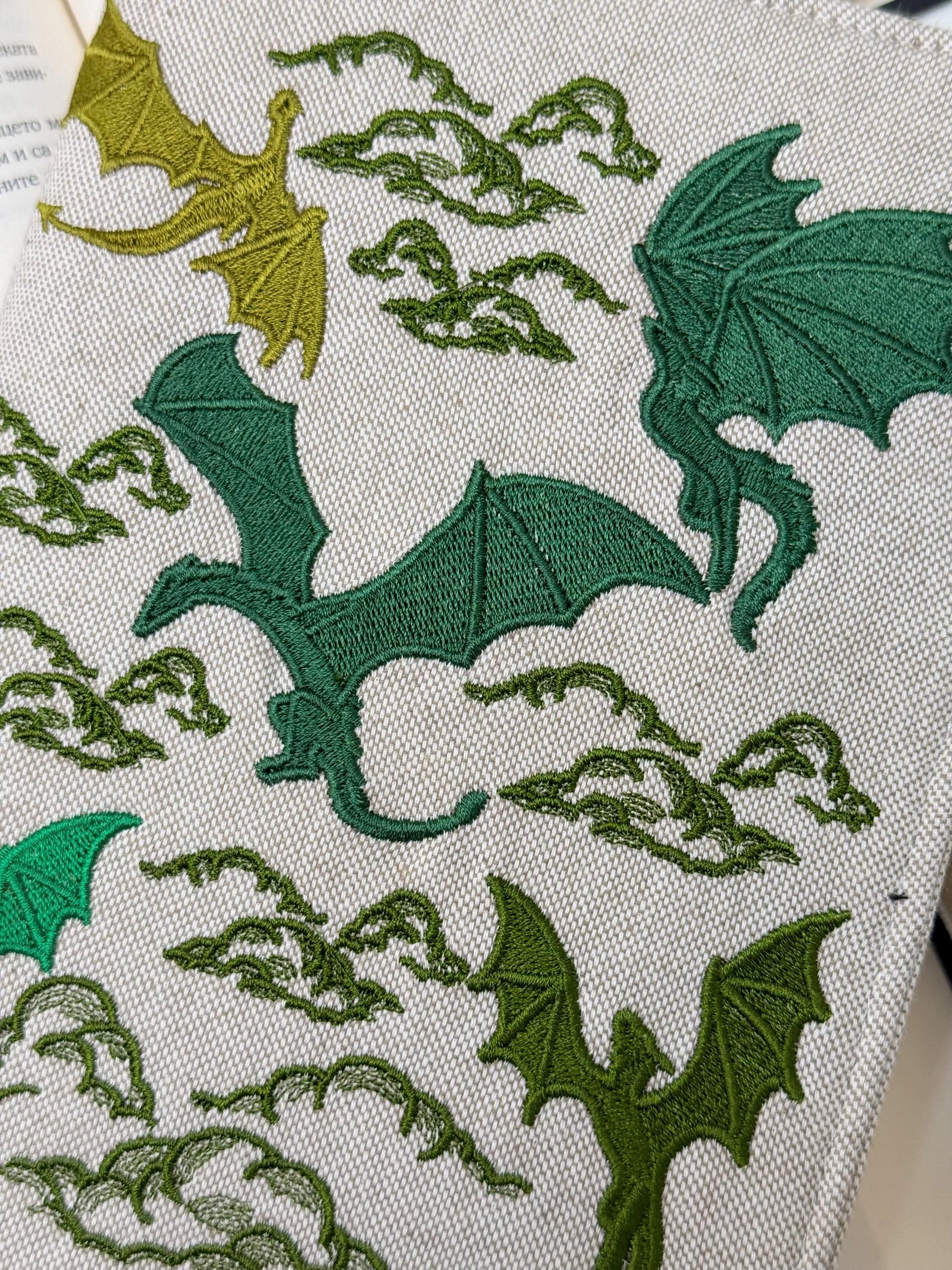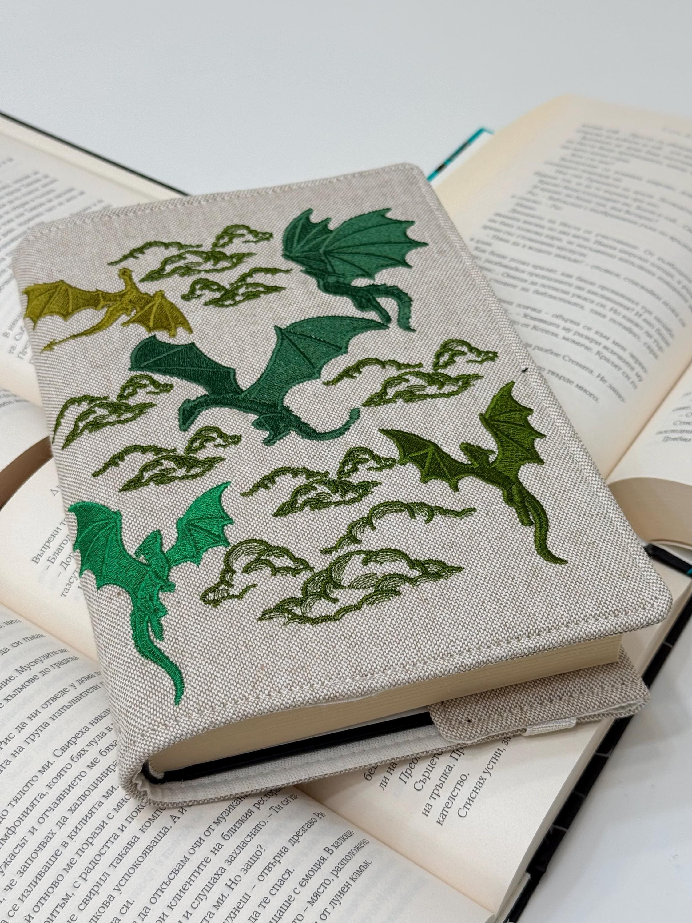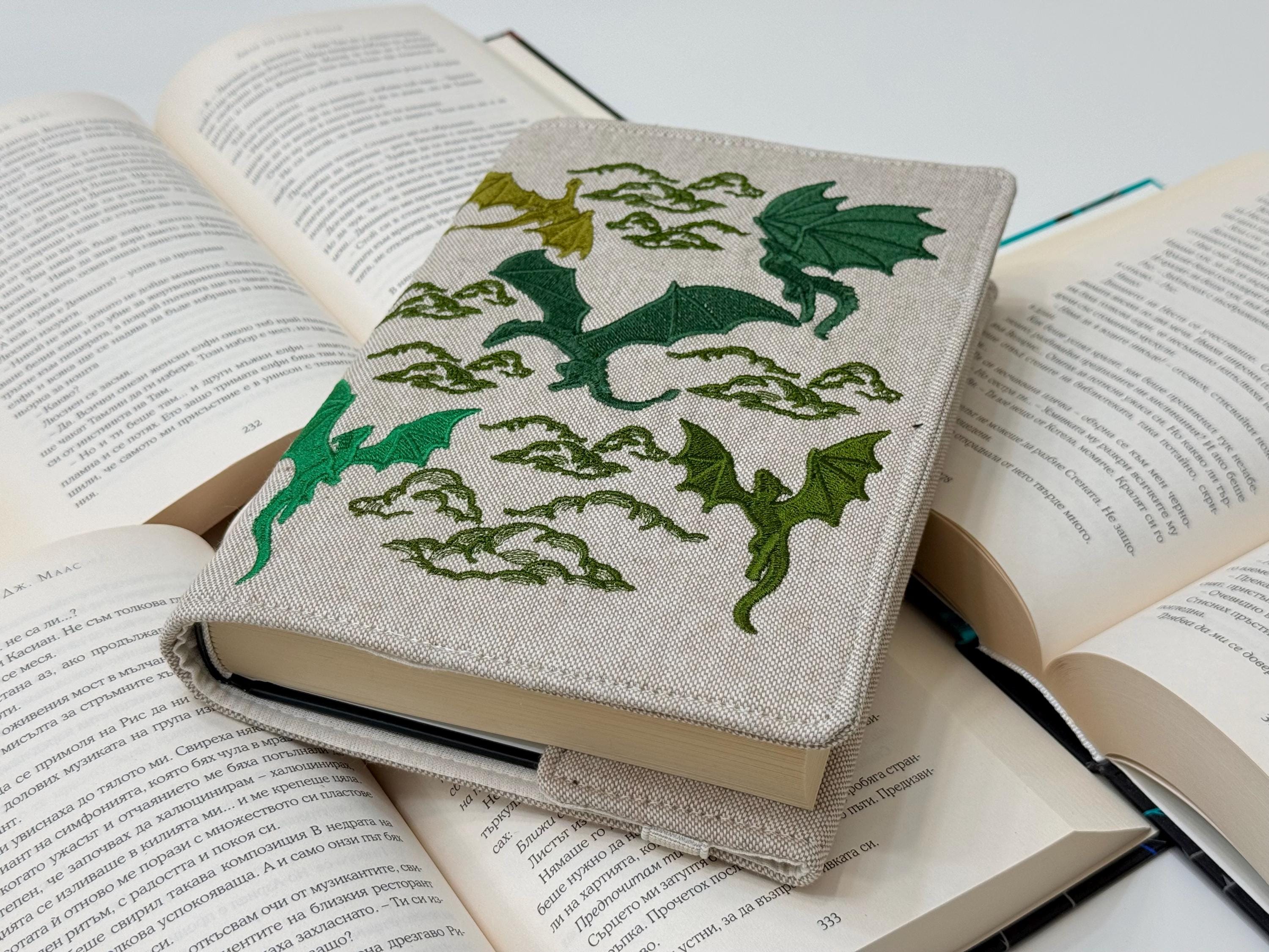 Unleash the magic of reading 🐉✨ This adjustable handmade book cover features my own embroidery design of gold dragons, crafted exclusively for Lullaby Crafts World. Created to snugly fit hardcover books, it offers both protection and fantasy-inspired beauty — the perfect mix of art and functionality.