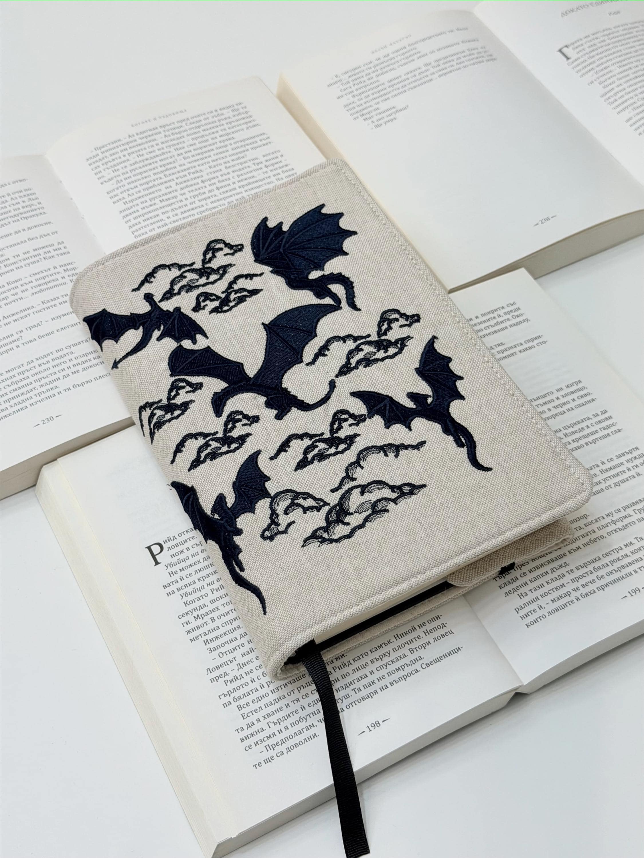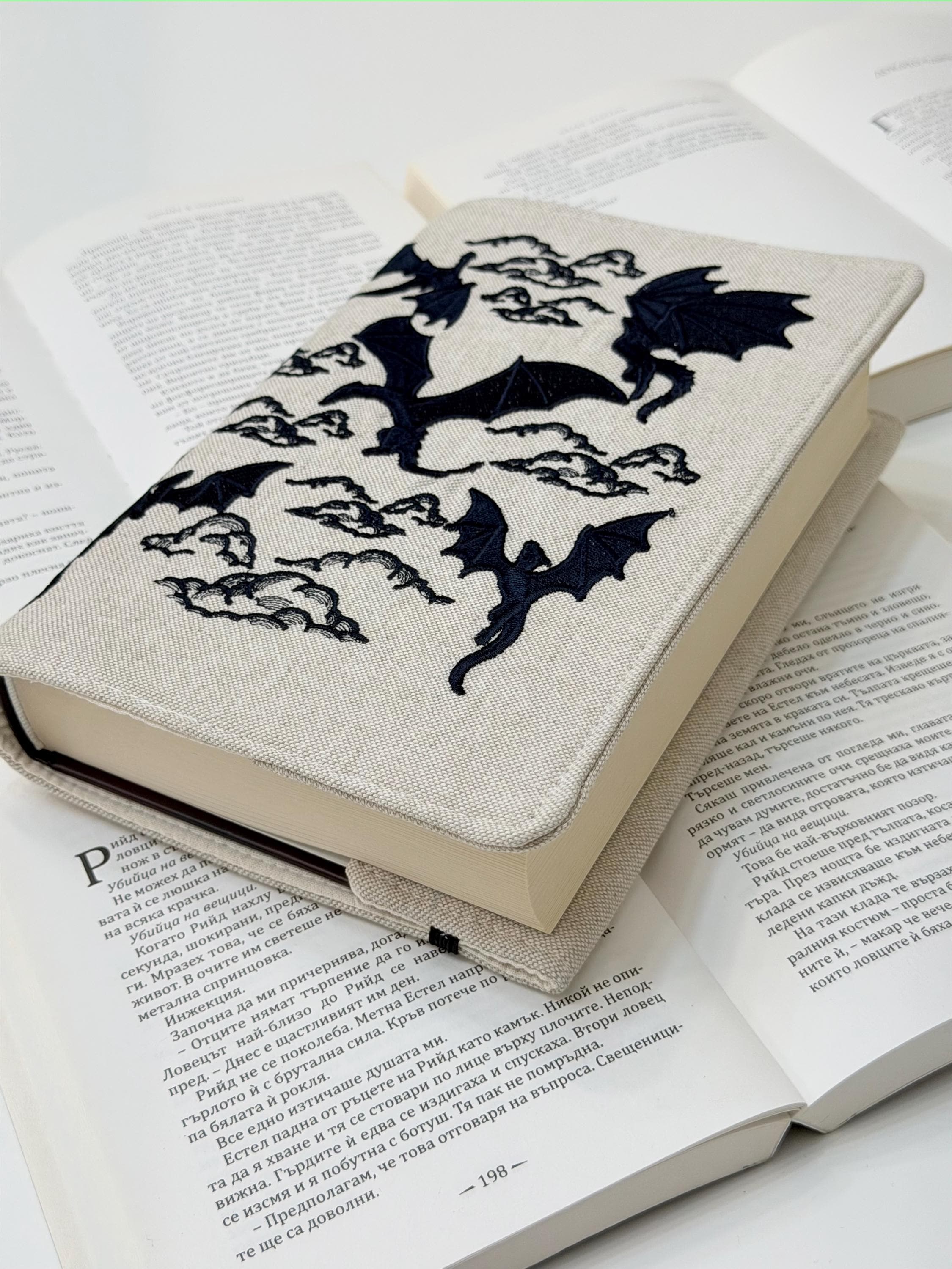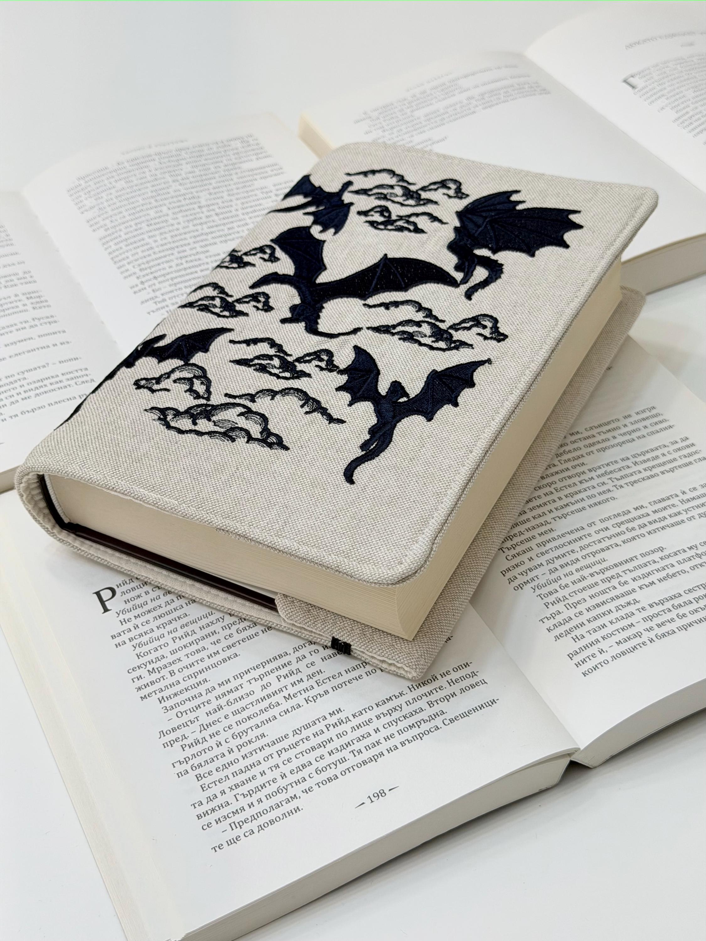 Unleash the magic of reading 🐉✨ This adjustable handmade book cover features my own embroidery design of dragons, crafted exclusively for Lullaby Crafts World. Created to snugly fit hardcover books, it offers both protection and fantasy-inspired beauty — the perfect mix of art and functionality.