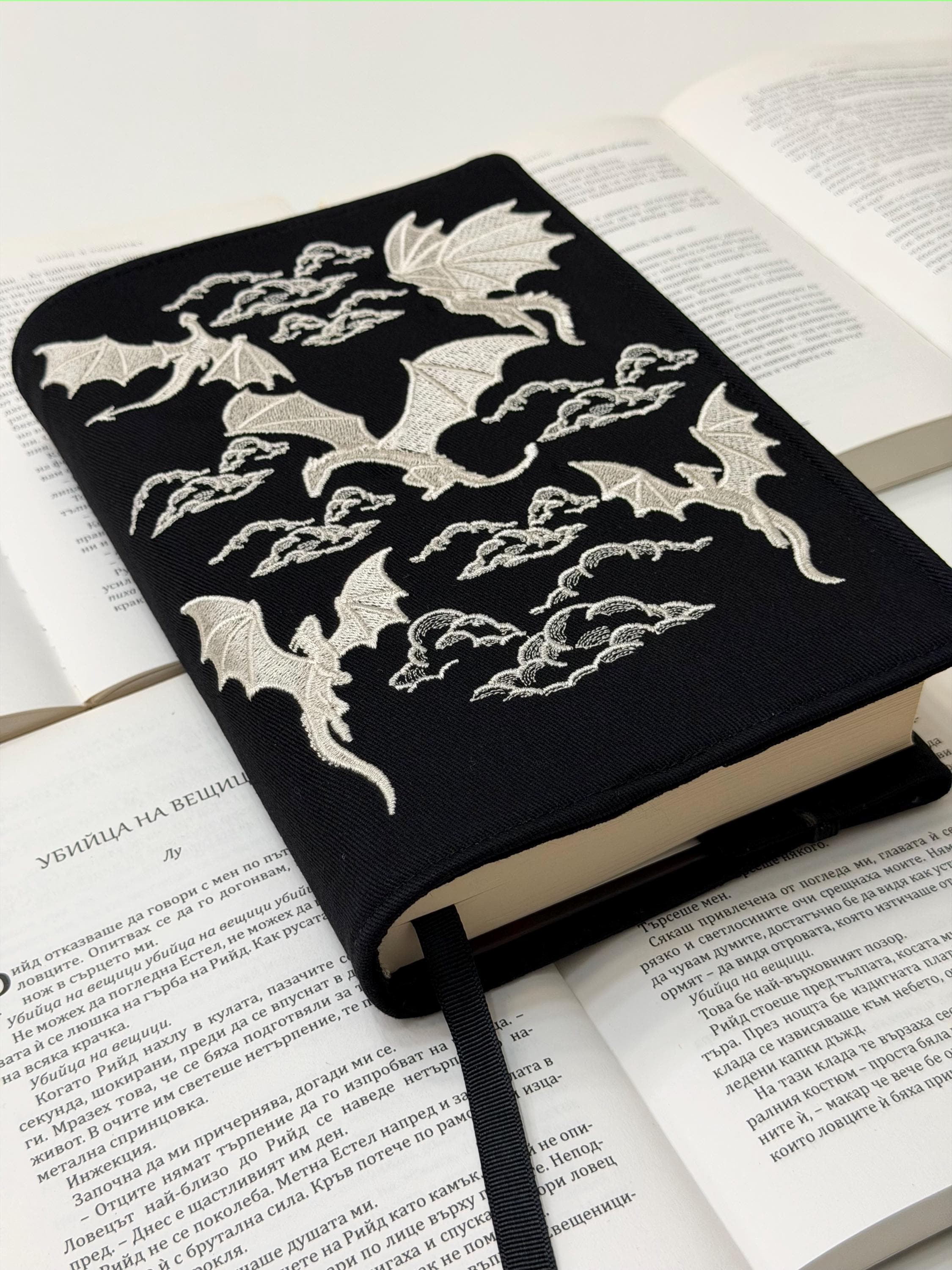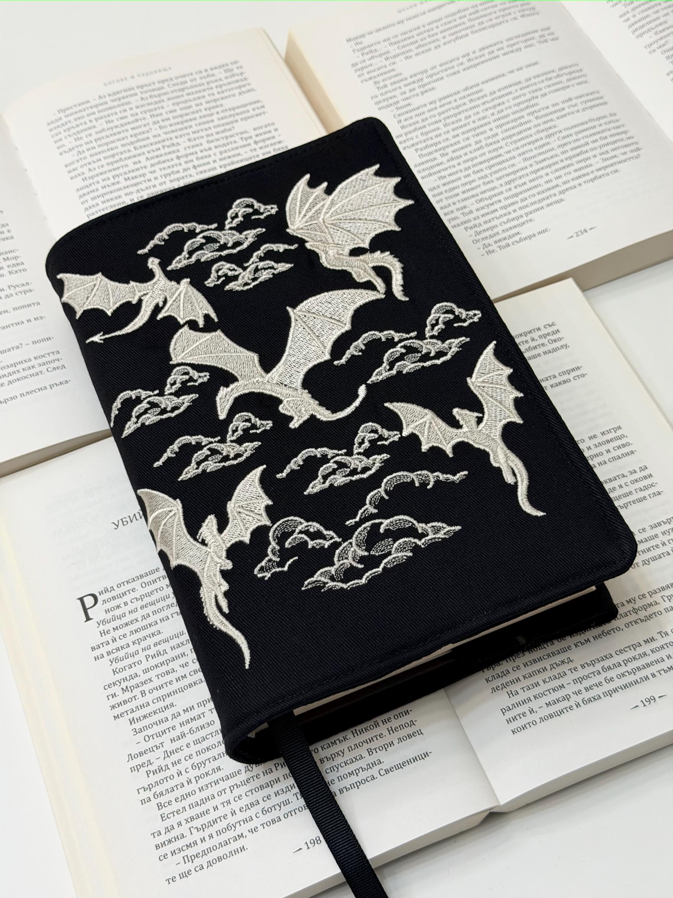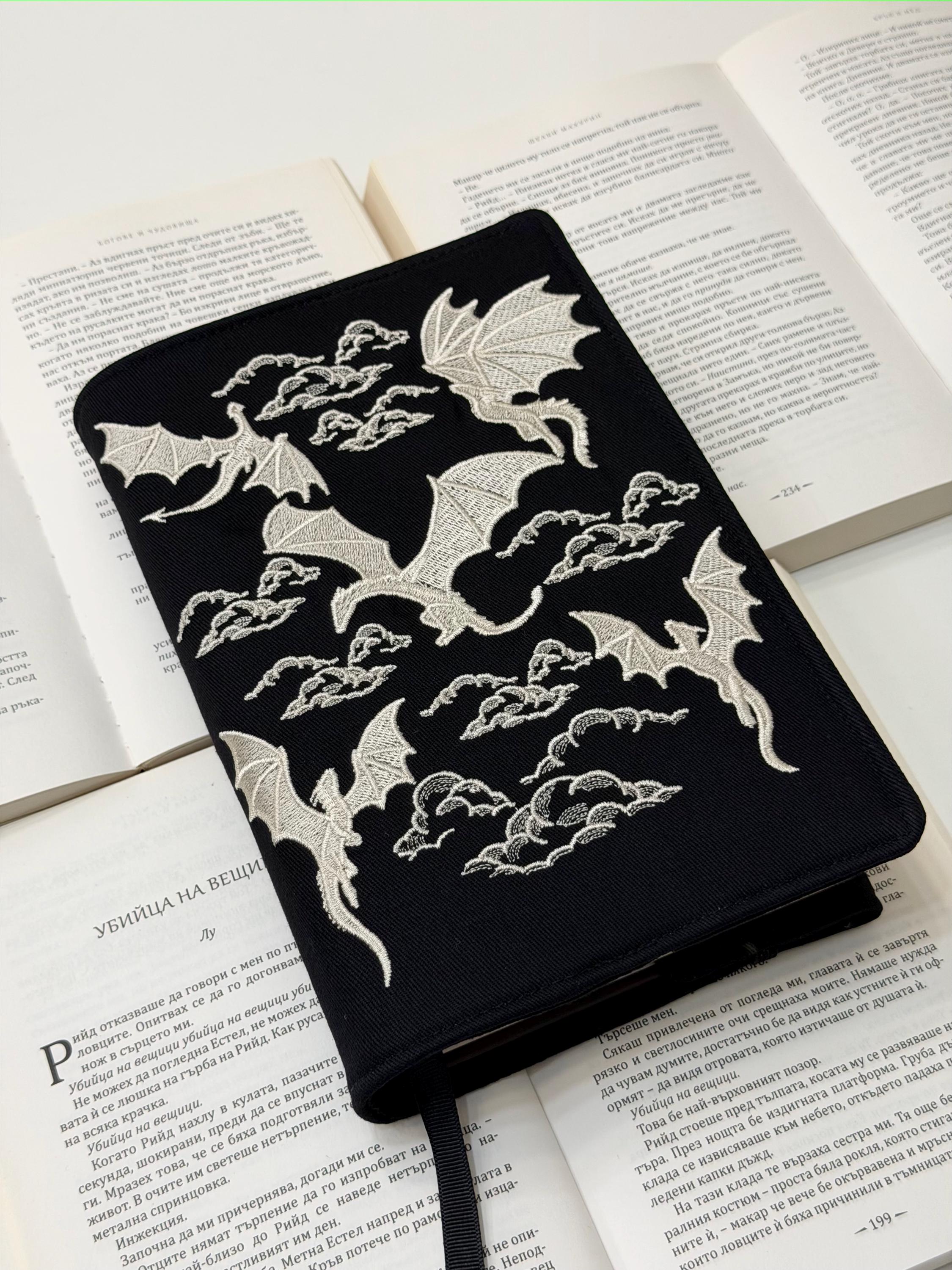 Unleash the magic of reading 🐉✨ This adjustable handmade book cover features my own embroidery design of dragons, crafted exclusively for Lullaby Crafts World. Created to snugly fit hardcover books, it offers both protection and fantasy-inspired beauty — the perfect mix of art and functionality.